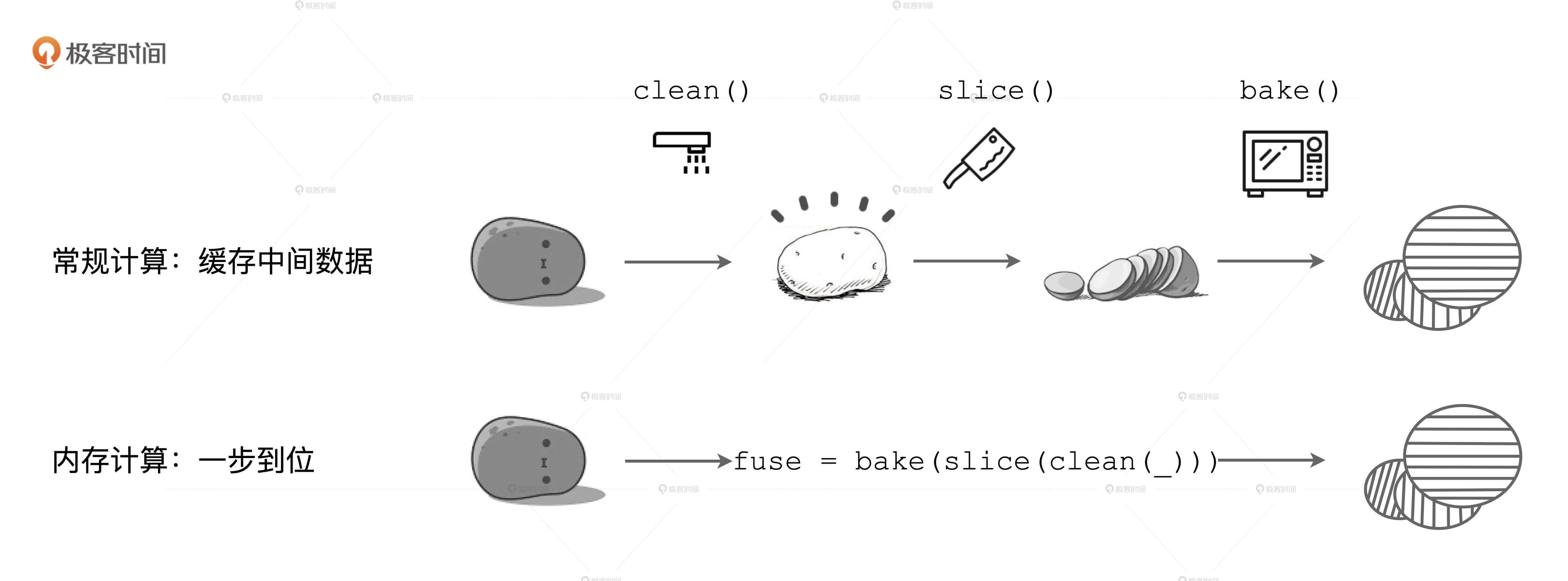 如图所示,在上面的计算流程中,如果你把流水线看作是内存,每一步操作过后都会生成临时数据,如图中的clean和slice,这些临时数据都会缓存在内存里。但在下面的内存计算中,所有操作步骤如clean、slice、bake,都会被捏合在一起构成一个函数。这个函数一次性地作用在“带泥土豆”上,直接生成“即食薯片”,在内存中不产生任何中间数据形态。