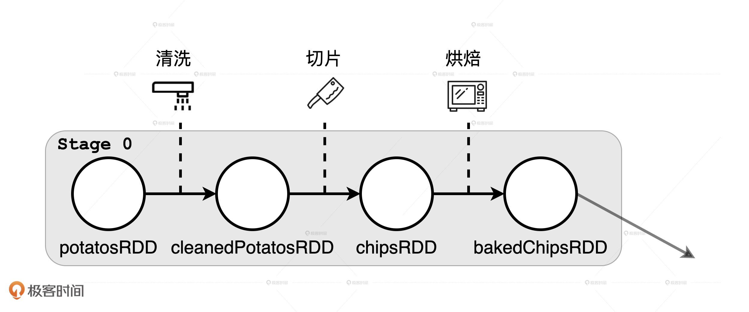 那么,这和Stage内的流水线式计算模式有啥关系呢?我们再回到土豆工坊的例子中,把目光集中在即食薯片分发之前,也就是刚刚划分出来的Stage 0。这一阶段包含3个处理操作,即清洗、切片和烘焙。按常理来说,流水线式的作业方式非常高效,带泥土豆被清洗过后,会沿着流水线被传送到切片机,切完的生薯片会继续沿着流水线再传送到烘焙烤箱,整个过程一气呵成。如果把流水线看作是计算节点内存的话,那么清洗、切片和烘焙这3个操作都是在内存中完成计算的。
