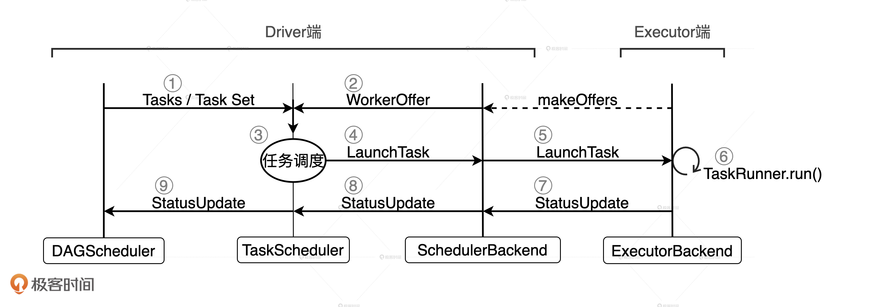 DAGScheduler的主要职责有二:一是把用户DAG拆分为Stages,如果你不记得这个过程可以回顾一下上一讲的内容;二是在Stage内创建计算任务Tasks,这些任务囊括了用户通过组合不同算子实现的数据转换逻辑。然后,执行器Executors接收到Tasks,会将其中封装的计算函数应用于分布式数据分片,去执行分布式的计算过程。