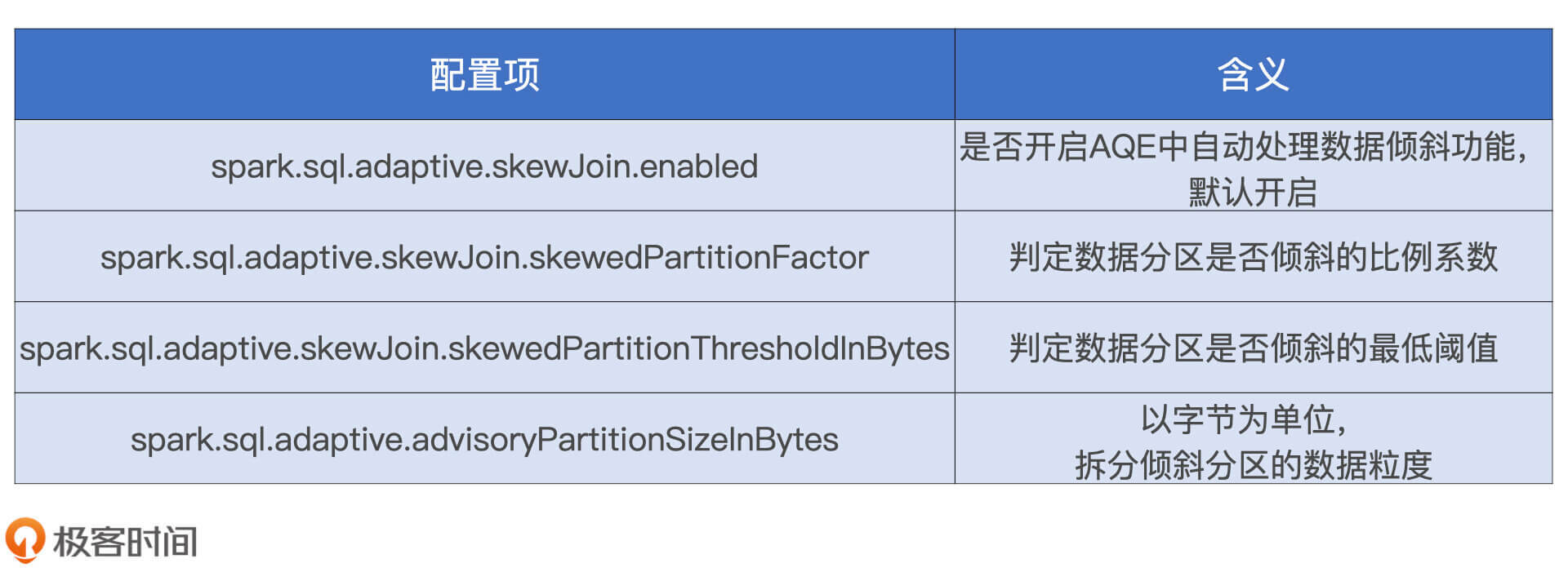 再来说说数据倾斜,在数据关联(Data Joins)的场景中,当AQE检测到倾斜的数据分区时,会自动进行拆分操作,把大分区拆成多个小分区,从而避免单个任务的数据处理量过大。不过,Spark 3.0版本发布的AQE,暂时只能在Sort Merge Join中自动处理数据倾斜,其他的Join实现方式如Shuffle Join还有待支持。