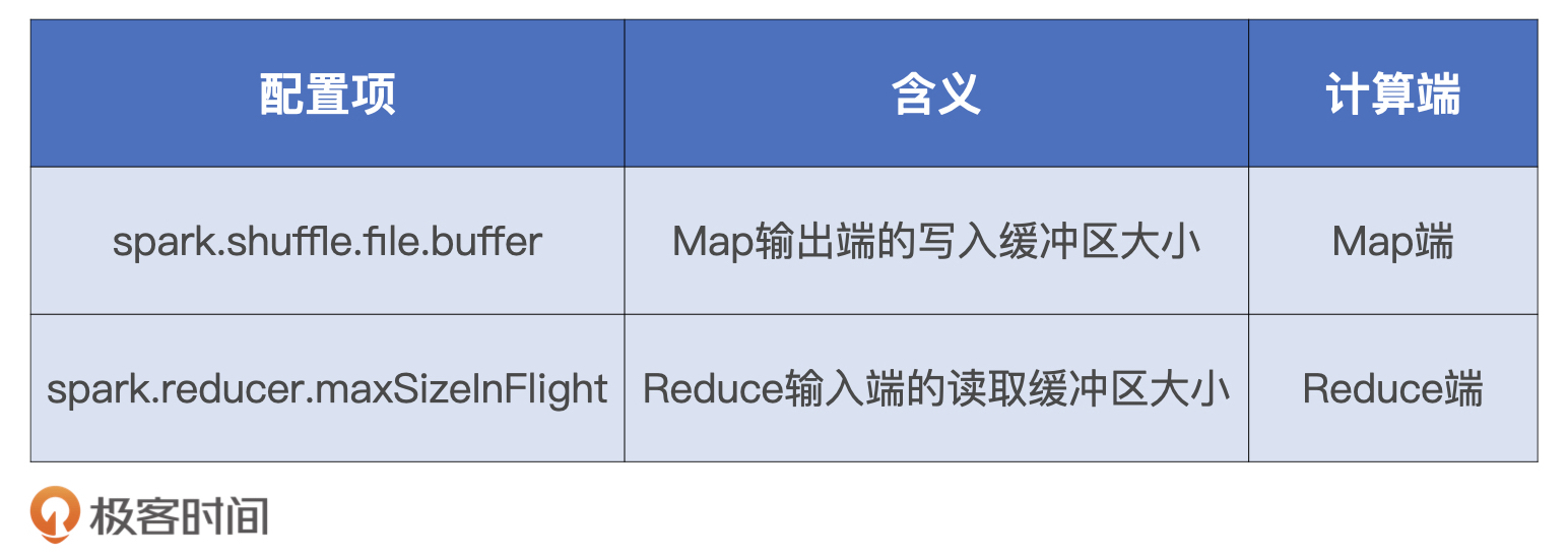 那么,我们就可以通过spark.shuffle.file.buffer和spark.reducer.maxSizeInFlight这两个配置项,来分别调节Map阶段和Reduce阶段读写缓冲区的大小。具体该怎么做呢?我们一一来看。
