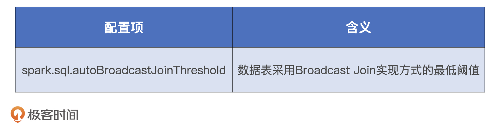 在Spark发布AQE之前,开发者可以利用spark.sql.autoBroadcastJoinThreshold配置项对数据关联操作进行主动降级。这个参数的默认值是10MB,参与Join的两张表中只要有一张数据表的尺寸小于10MB,二者的关联操作就可以降级为Broadcast Join。为了充分利用Broadcast Join“以小博大”的优势,你可以考虑把这个参数值调大一些,2GB左右往往是个不错的选择。