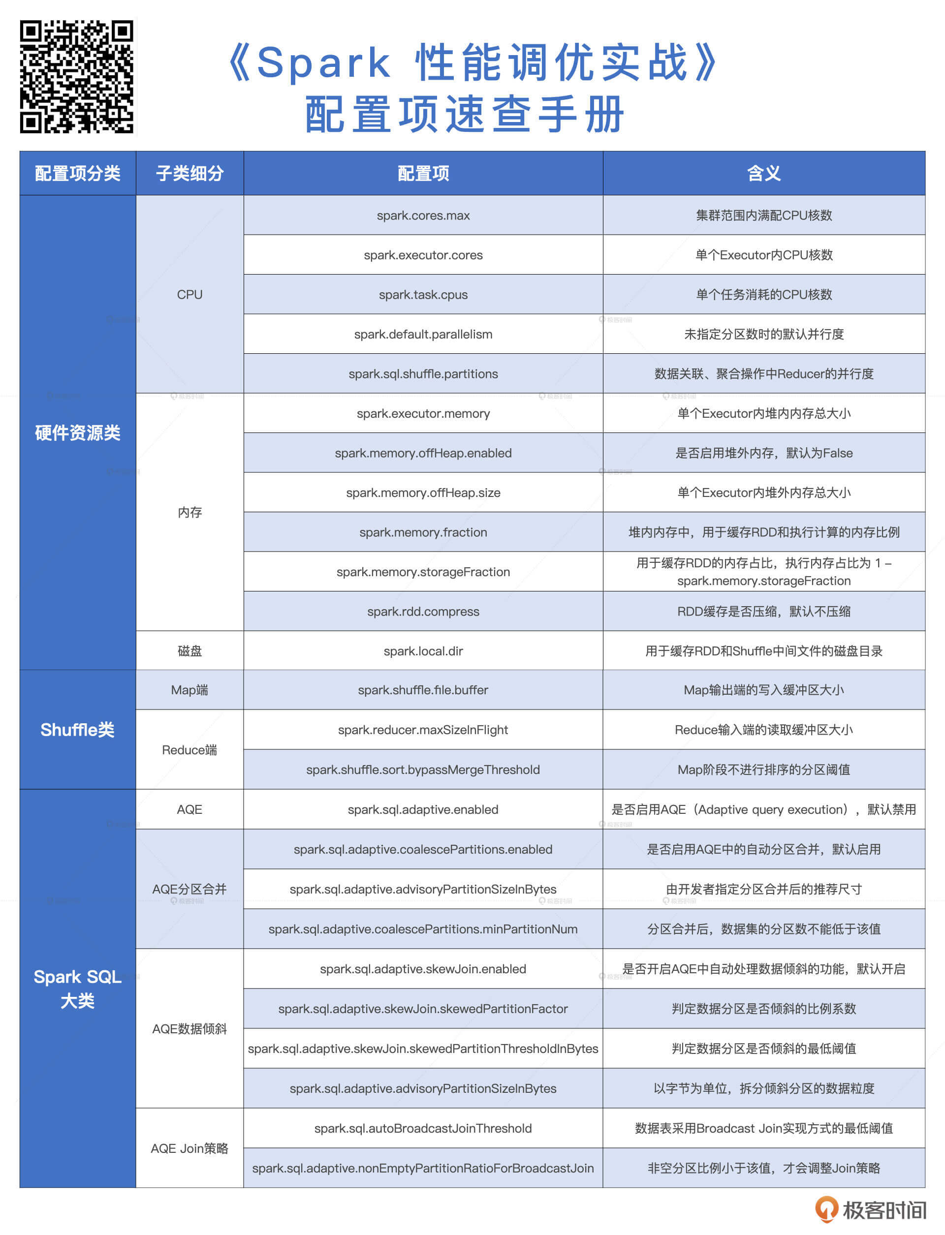 好啦,经过这两讲的学习,我们一起汇总出了Spark中与性能调优息息相关的所有配置项,为了方便你快速查阅,我把它们合并在了一张文稿的表格中,希望你能在工作中好好利用起来。