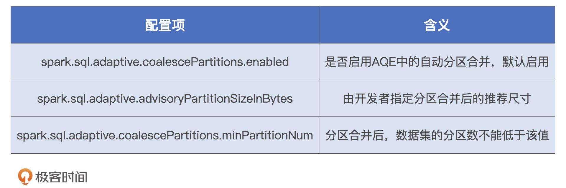 那么,“目标尺寸”由什么来决定的呢?Spark提供了两个配置项来共同决定分区合并的“目标尺寸”,它们分别是spark.sql.adaptive.advisoryPartitionSizeInBytes和spark.sql.adaptive.coalescePartitions.minPartitionNum。