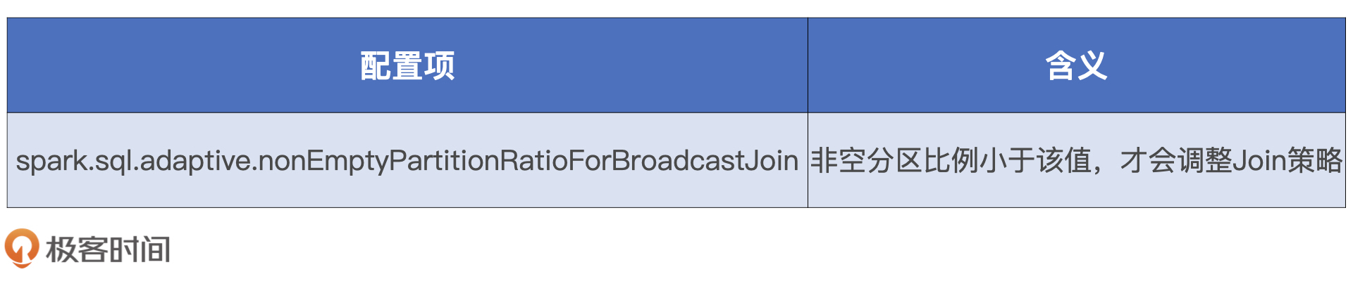 不过,启用动态Join策略调整还有个前提,也就是要满足nonEmptyPartitionRatioForBroadcastJoin参数的限制。这个参数的默认值是0.2,大表过滤之后,非空的数据分区占比要小于0.2,才能成功触发Broadcast Join降级。