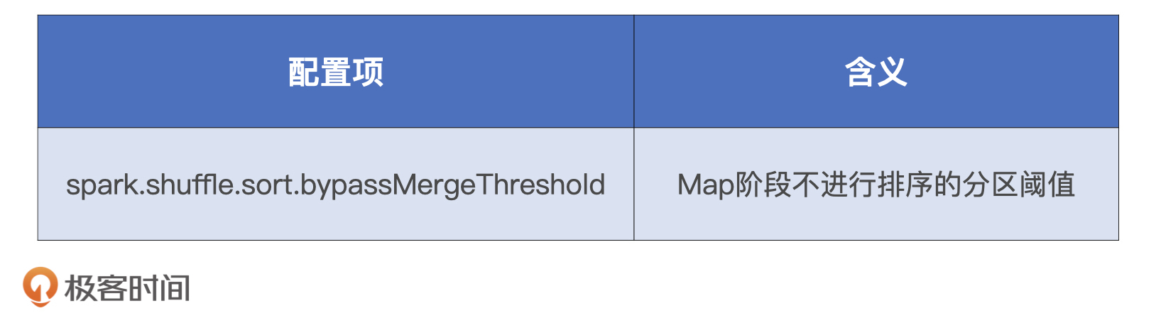 因此,在不需要聚合,也不需要排序的计算场景中,我们就可以通过设置spark.shuffle.sort.bypassMergeThreshold的参数,来改变Reduce端的并行度(默认值是200)。当Reduce端的分区数小于这个设置值的时候,我们就能避免Shuffle在计算过程引入排序。
