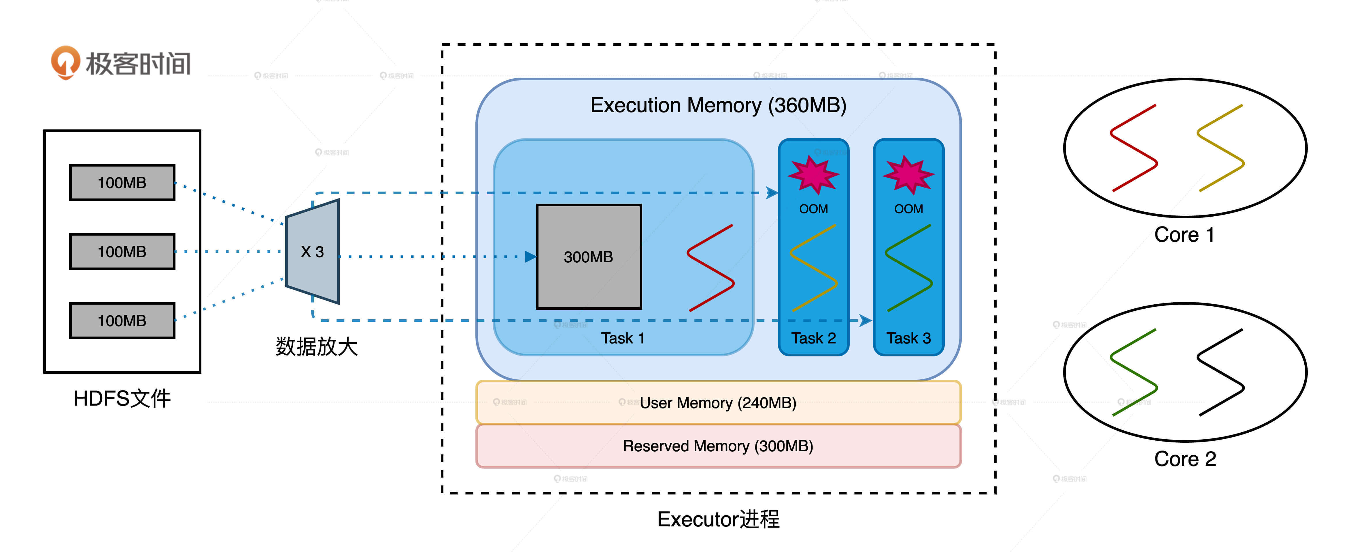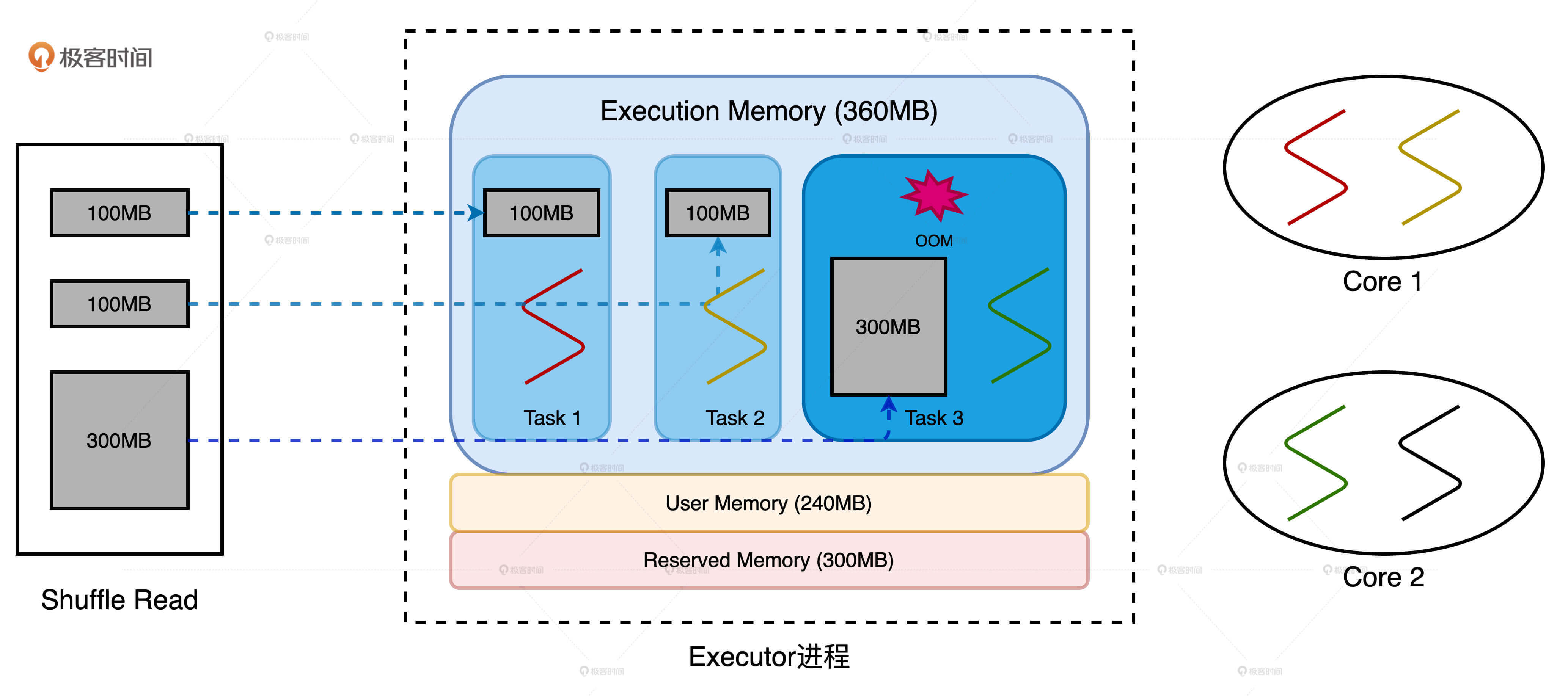发生在Executors侧的OOM只和User Memory和Execution Memory区域有关,因为它们都和任务执行有关。其中,User Memory区域OOM的产生的原因和解决办法与Driver别无二致,你可以直接参考。