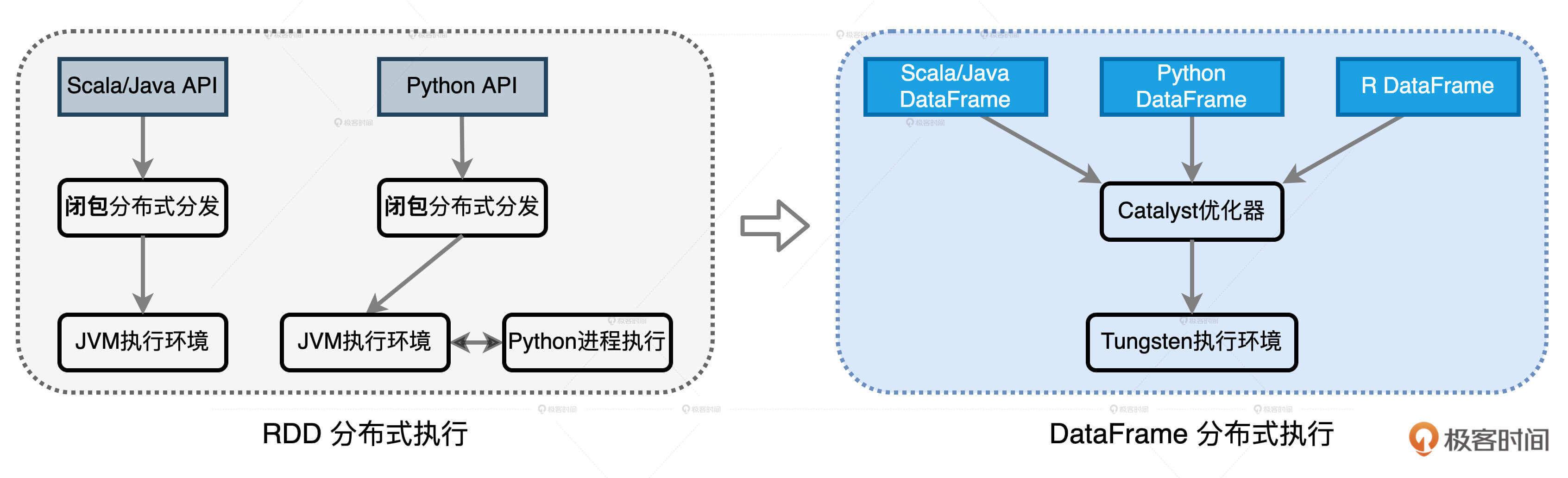 那么问题来了,有了DataFrame API,负责引擎内核优化的那个幕后英雄是谁?为了支持DataFrame开发模式,Spark从1.3版本开始推出Spark SQL。Spark SQL的核心组件有二,其一是Catalyst优化器,其二是Tungsten。关于Catalyst和Tungsten的特性和优化过程,我们在后面的两讲再去展开,今天这一讲,咱们专注在它们和DataFrame的关系。