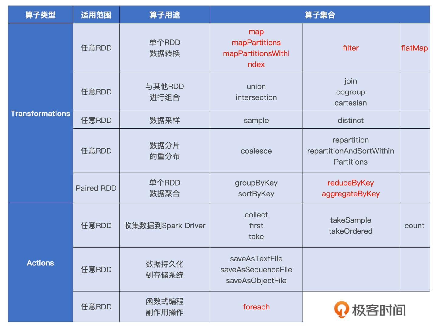 在RDD的开发框架下,我们调用RDD算子进行适当的排列组合,就可以很轻松地实现业务逻辑。我把这些使用频繁的RDD算子总结到了下面的表格里,你可以看一看。
