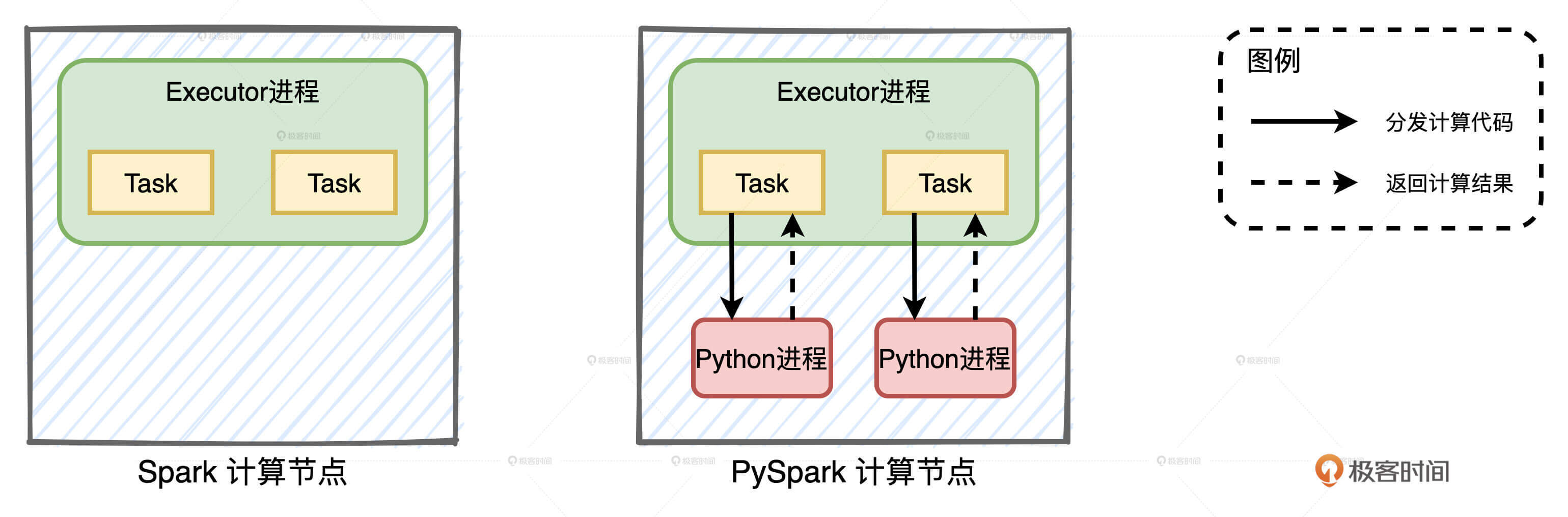 当我们使用Java或者Scala语言做开发时,所有的计算都在JVM进程内完成,如图中左侧的Spark计算节点所示。