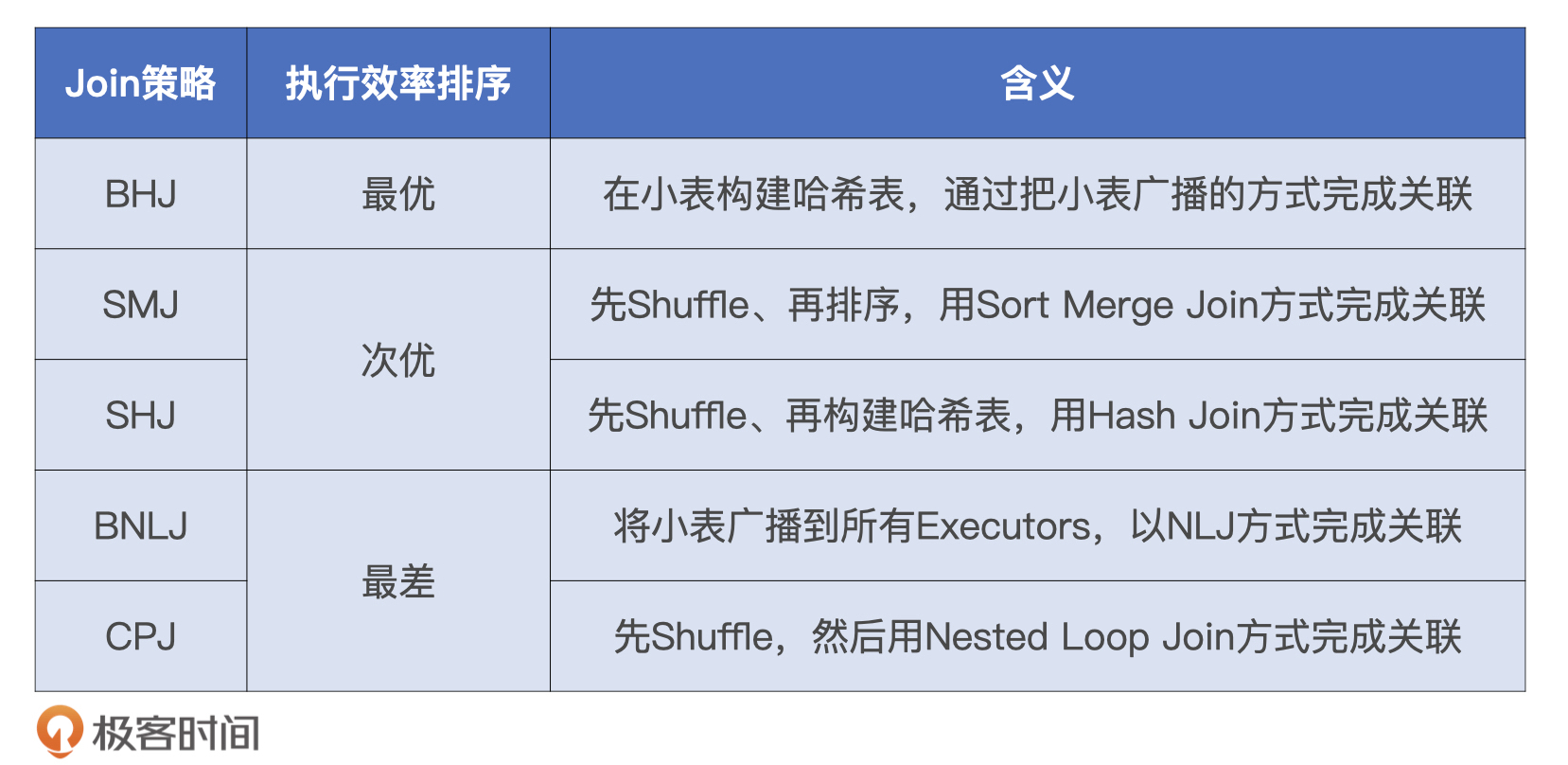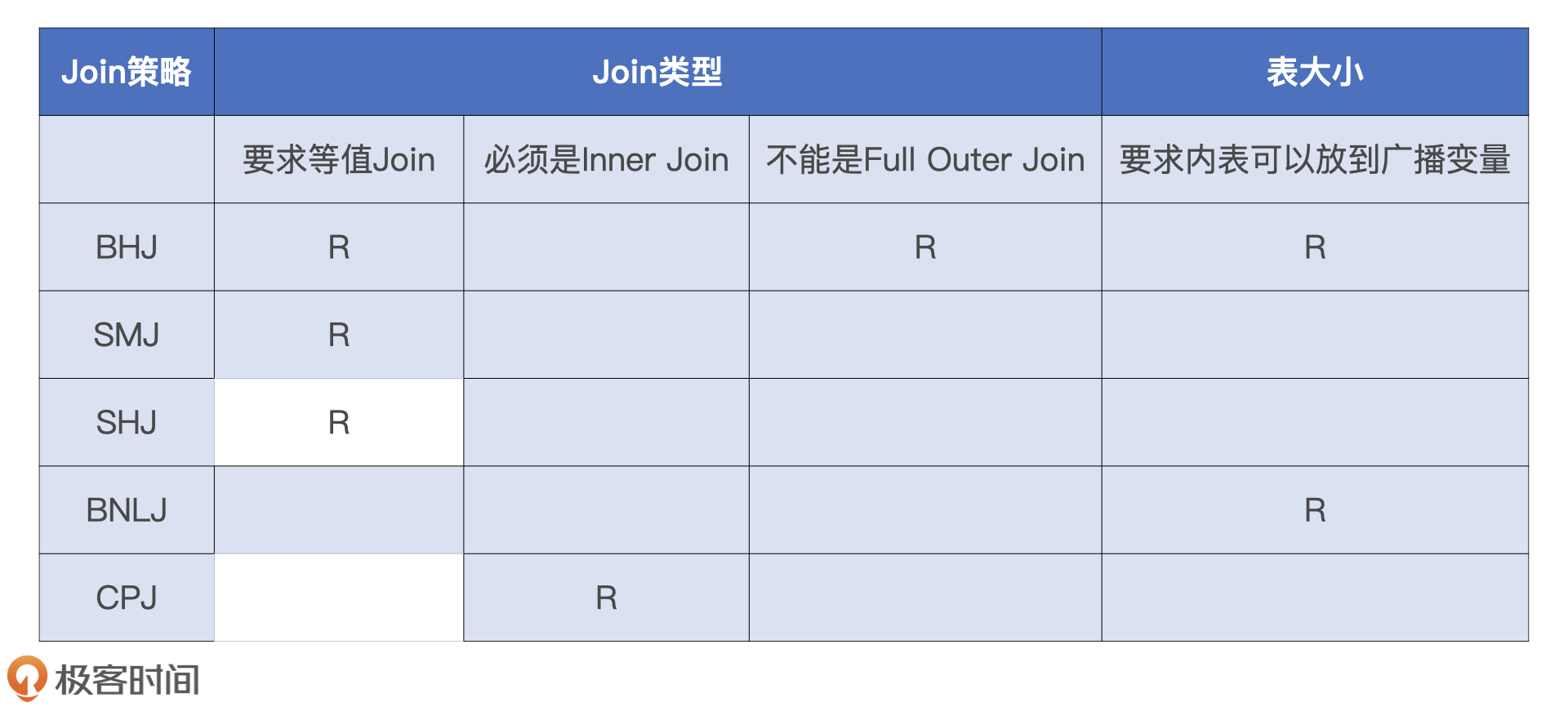 5大Join策略对于这些信息的要求,我都整理到了下面的表格里,你可以看一看。