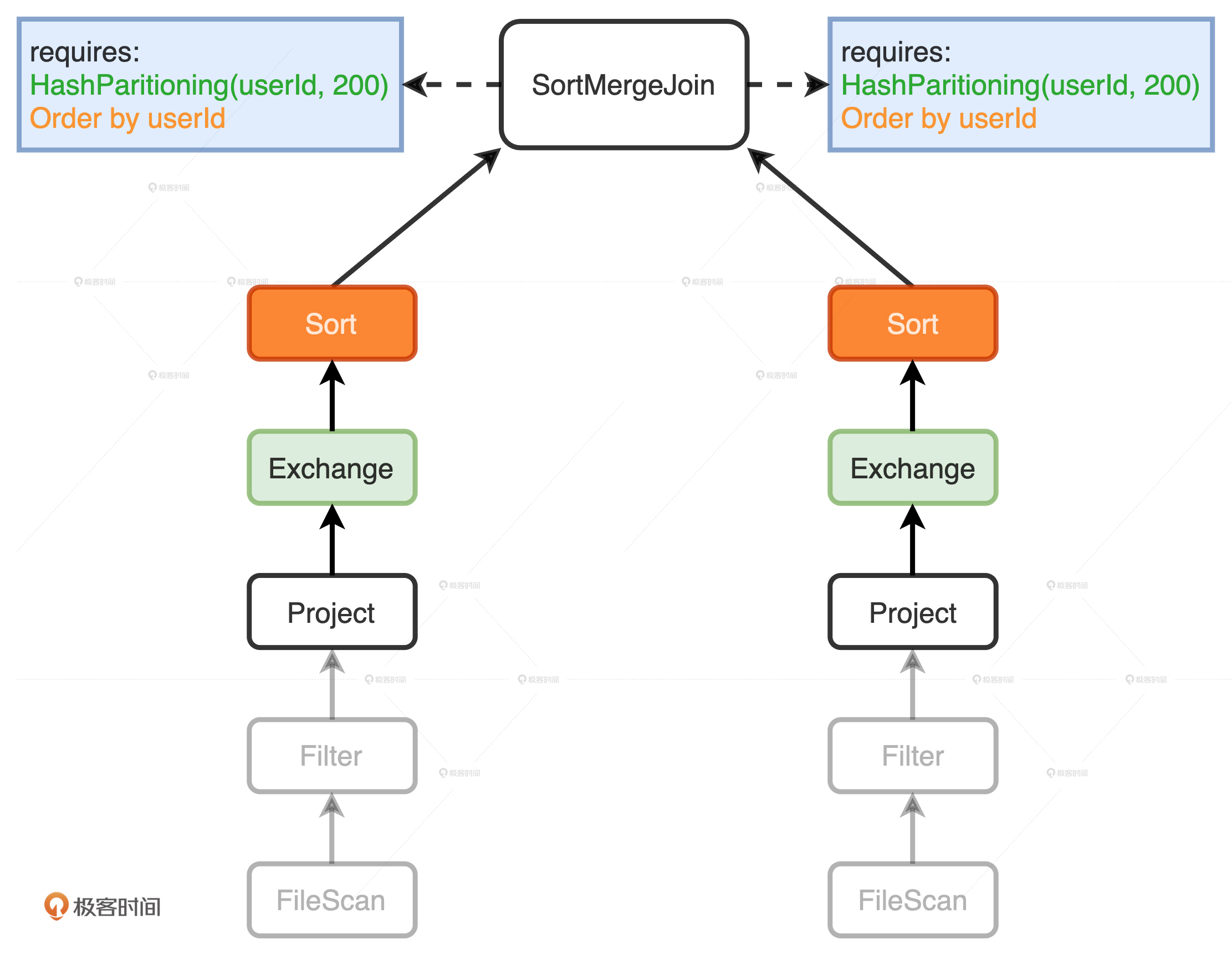 但是,SortMergeJoin对于输入数据的要求很明确:按照userId分成200个分区且排好序,而这两个Project子节点的输出显然并没有满足父节点SortMergeJoin的要求。这个时候,EnsureRequirements规则就要介入了,它通过添加必要的操作符,如Shuffle和排序,来保证SortMergeJoin节点对于输入数据的要求一定要得到满足,如下图所示。