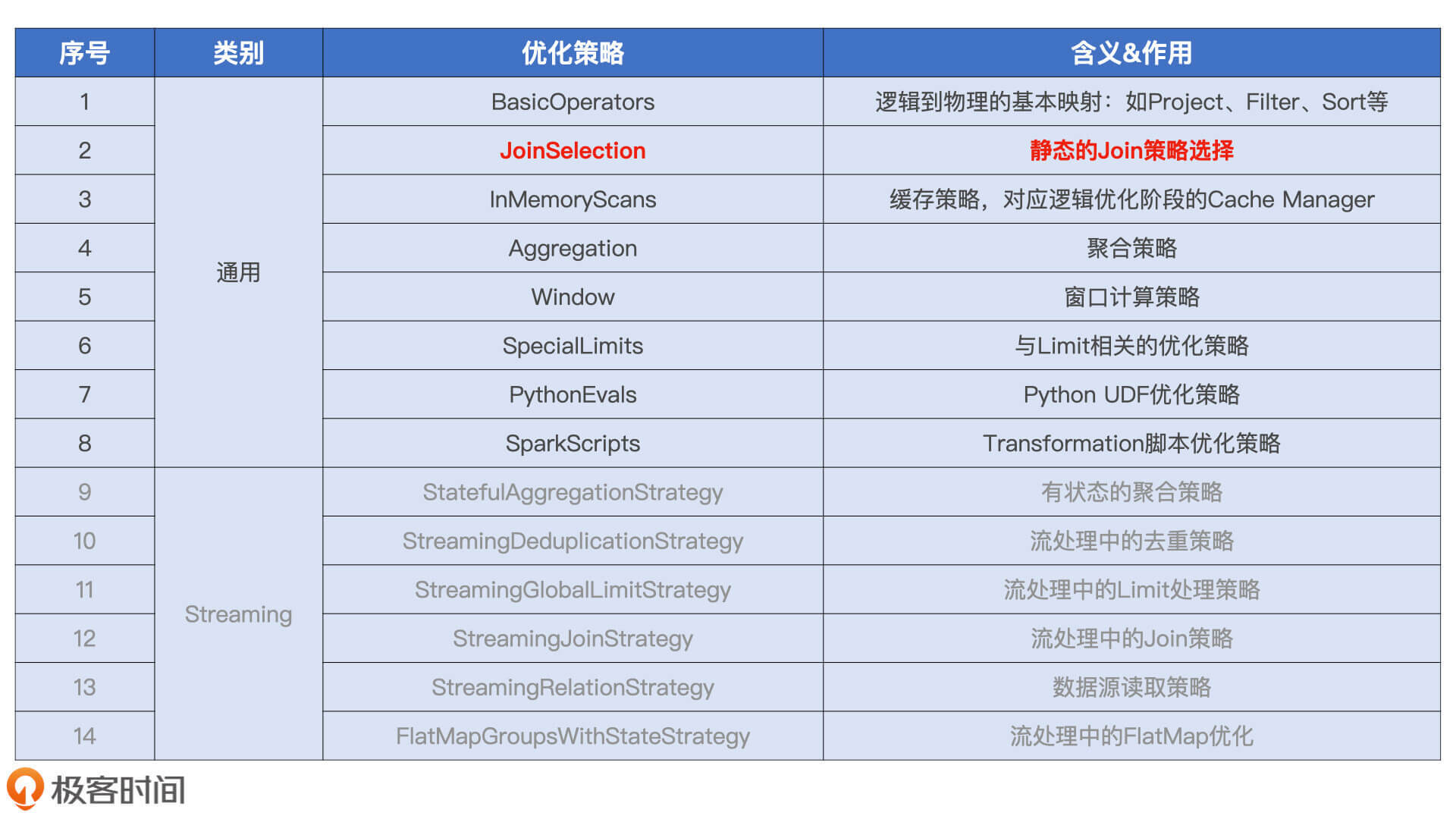 那我们该抓谁做“典型”呢?我觉得,这个“典型”至少要满足两个标准:一,它要在我们的应用场景中非常普遍;二,它的取舍对于执行性能的影响最为关键。以这两个标准去遴选上面的8类策略,我们分分钟就能锁定JoinSelection。接下来,我们就以JoinSelection为例,详细讲解这一环节的优化过程。