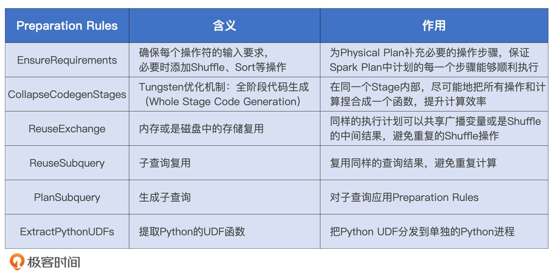 从上图中我们可以看到,从Spark Plan到Physical Plan的转换,需要几组叫做Preparation Rules的规则。这些规则坚守最后一班岗,负责生成Physical Plan。那么,这些规则都是什么,它们都做了哪些事情呢?我们一起来看一下。