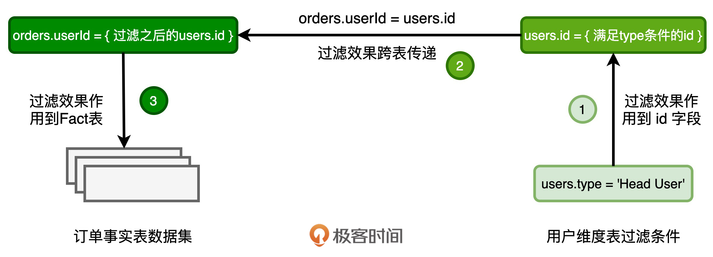 然后,在关联关系也就是orders.userId = users.id的作用下,过滤效果会通过users的ID字段传导到事实表的userId字段,也就是图中的步骤2。这样一来,满足关联关系的userId值,也是事实表userId全集中的一个子集。把满足条件的userId作为过滤条件,应用(Apply)到事实表的数据源,就可以做到减少数据扫描量,提升I/O效率,如图中的步骤3所示。