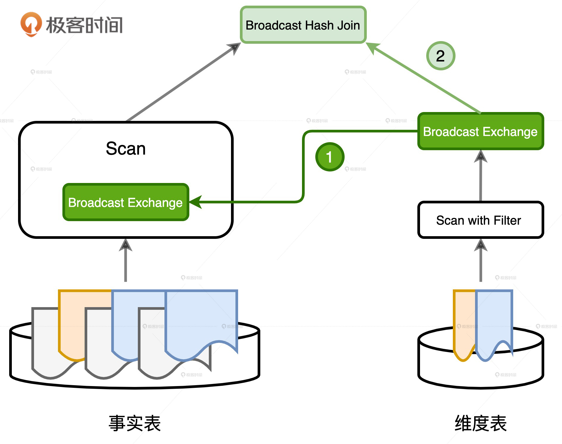 第二个作用就是参与后续的Broadcast Join数据关联,如图中的步骤2所示。这里的哈希表,本质上就是Hash Join中的Build Table,其中的Key、Value,记录着数据关联中所需的所有字段,如users.id、users.name,刚好拿来和事实表做Broadcast Hash Join。