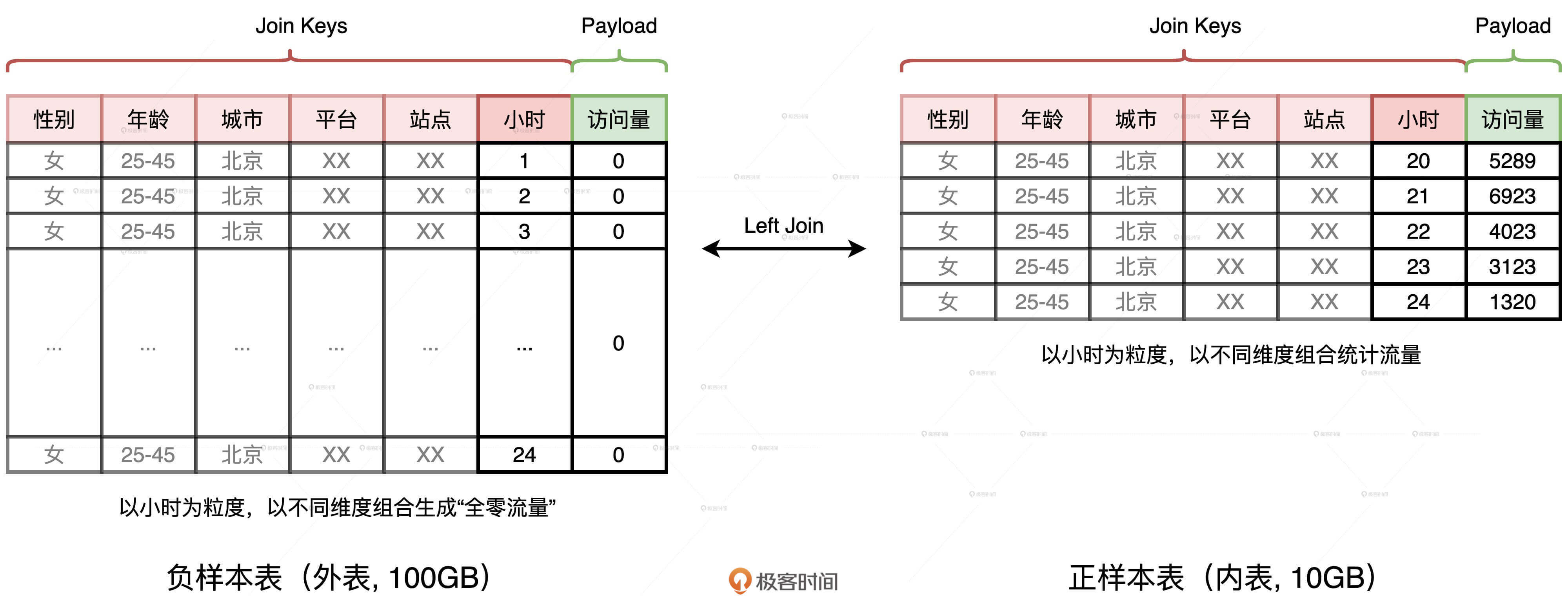 首先,我们生成一张全零流量表,如图中左侧的“负样本表”所示。这张表的主键是划分流量种类的各种维度,如性别、年龄、平台、站点、小时时段等等。表的Payload只有一列,也即访问量,在生成“负样本表”的时候,这一列全部置零。