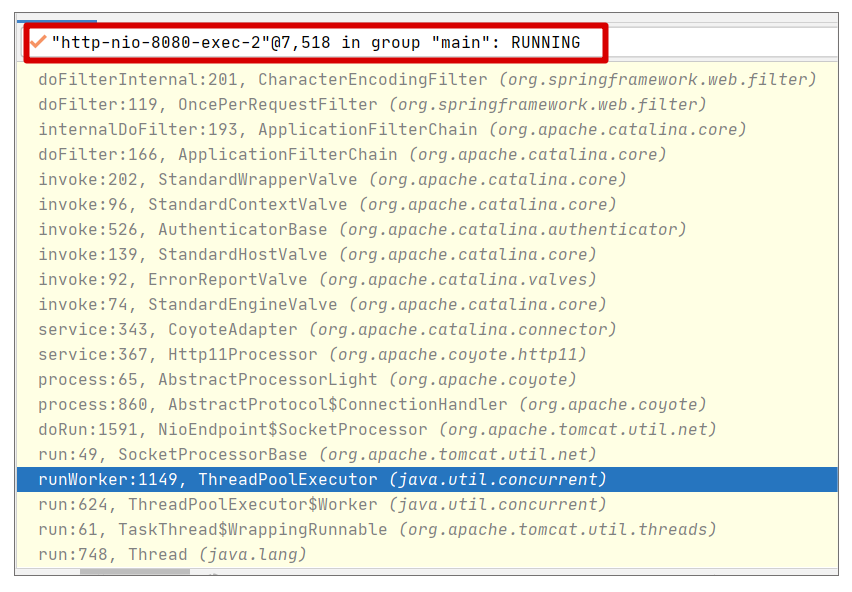在上述调用中,最终会进入Spring Boot的处理核心,即DispatcherServlet(上述调用栈没有继续截取完整调用,所以未显示)。可以说,DispatcherServlet是用来处理HTTP请求的中央调度入口程序,为每一个 Web 请求映射一个请求的处理执行体(API controller/method)。