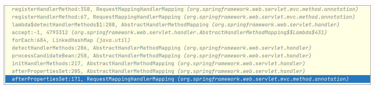 寻找方法参考DispatcherServlet#getHandler,具体的查找远比开始给出的Map查找来得复杂,但是无非还是一个根据请求寻找候选执行方法的过程,这里我们可以通过一个调试视图感受下这种对应关系: