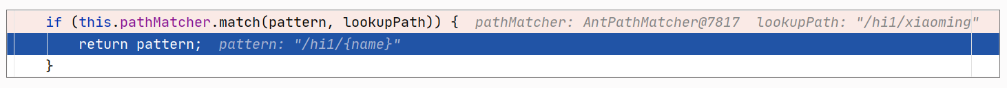 在我们的案例中,当使用 http://localhost:8080/hi1/xiaoming 访问时,其中 patternsCondition 是可以匹配上的。实际的匹配方法执行是通过 AntPathMatcher#match 来执行,判断的相关参数可参考以下调试视图: