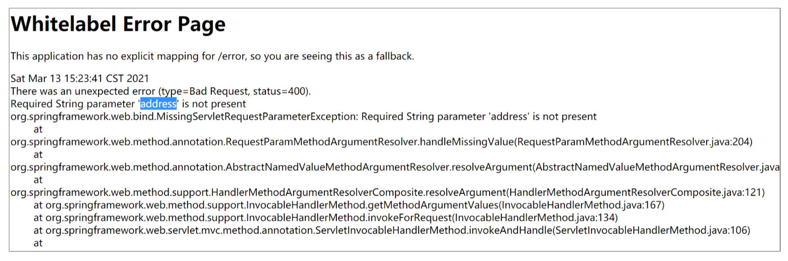 然后,我们使用一些看似明显符合日期格式的 URL 来访问,例如 http://localhost:8080/hi6?date=2021-5-1 20:26:53,我们会发现 Spring 并不能完成转化,而是报错如下: