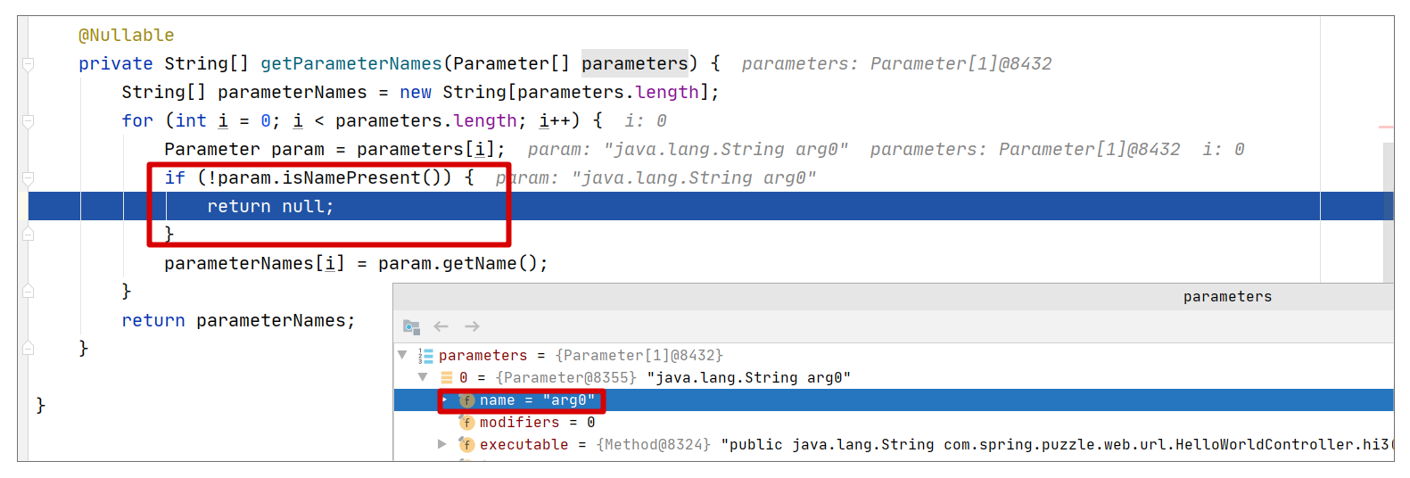 所以很明显,在这个测试程序中,我们给上层返回的是一个 String,这个 String 的值最终是需要做转化才能赋值给其他类型。例如对于案例中的”int age”定义,是需要转化为 int 基本类型的。这个基本流程可以通过 AbstractNamedValueMethodArgumentResolver#resolveArgument 的关键代码来验证: