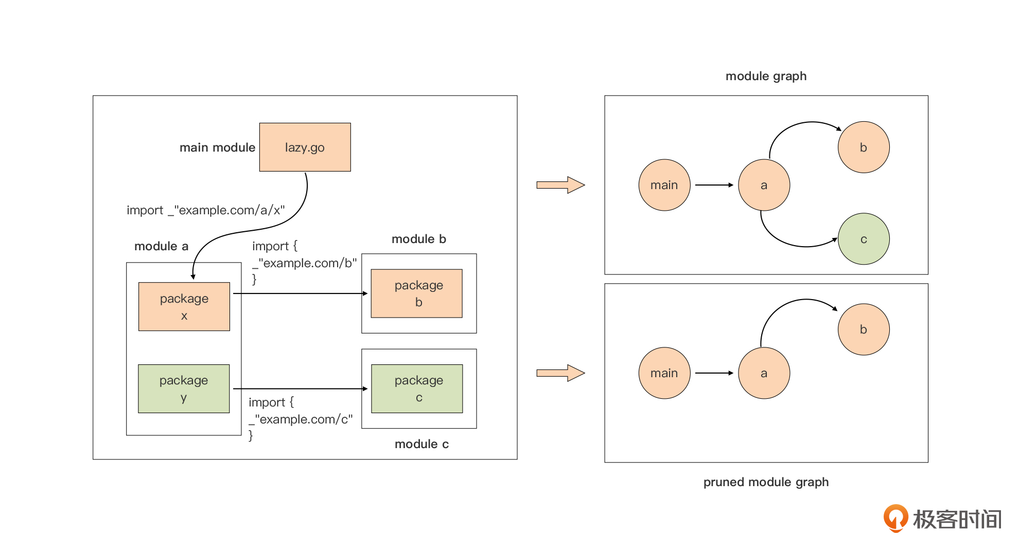 在这个示例中,main module中的lazy.go导入了module a的package x,后者则导入了module b中的package b。并且,module a还有一个package y,这个包导入了module c的package c。通过go mod graph命令,我们可以得到main module的完整module依赖图,也就是上图的右上角的那张。