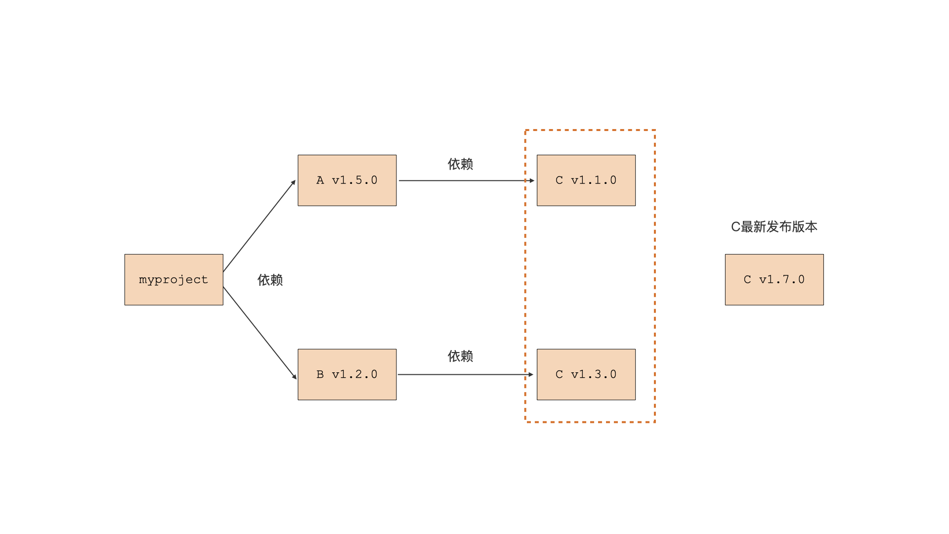 在前面的例子中,Go命令都是在项目初始状态分析项目的依赖,并且项目中两个依赖包之间没有共同的依赖,这样的包依赖关系解决起来还是比较容易的。但依赖关系一旦复杂起来,比如像下图中展示的这样,Go又是如何确定使用依赖包C的哪个版本的呢?-