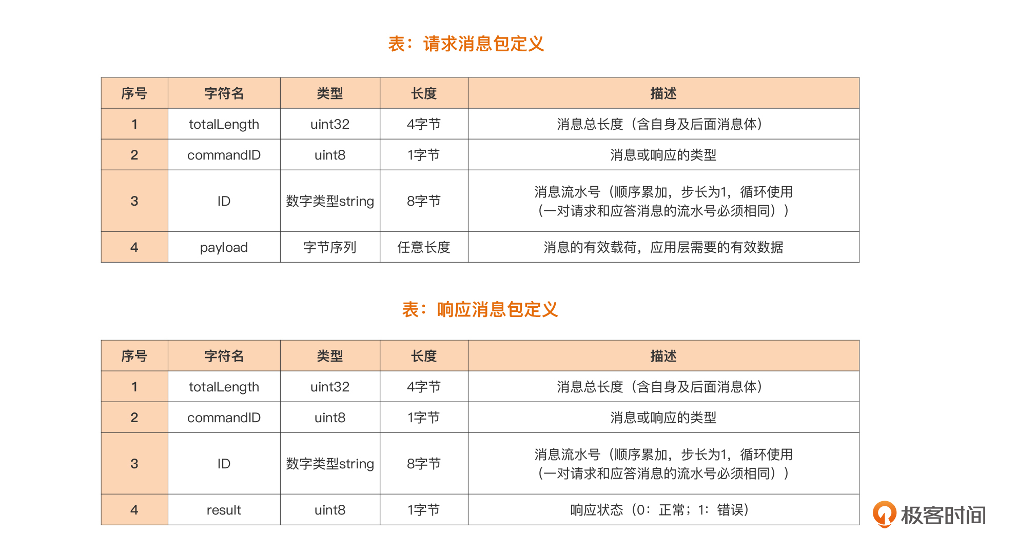 相比之下,二进制模式要比文本模式编码更紧凑也更高效,所以我们这个问题中的自定义协议也采用了二进制模式,协议规范内容如下图: