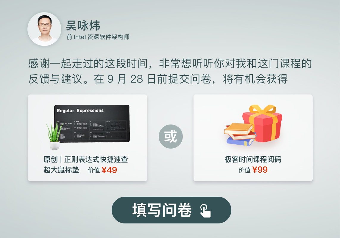 《Vim 实用技巧必知必会》课程结束了,这里有一份毕业问卷,题目不多,希望你能花两分钟填一下。十分期待能听到你说一说,你对这个课程的想法和建议。-