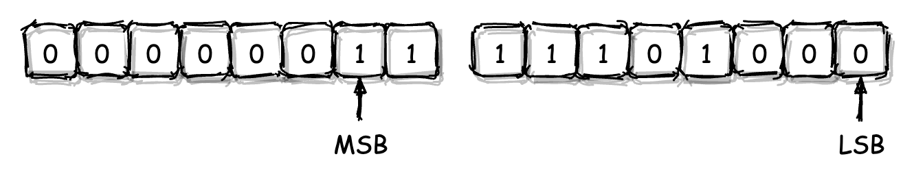 对于一个多字节数据,我们会将其二进制形式下,用于组成该数字值的最低有效数字位与最高有效数字位,分别称为这个数据的“最低有效位(LSB,Least Significant Bit)”和“最高有效位(MSB,Most Significant Bit)”。如上图我们所标记出的那样。
