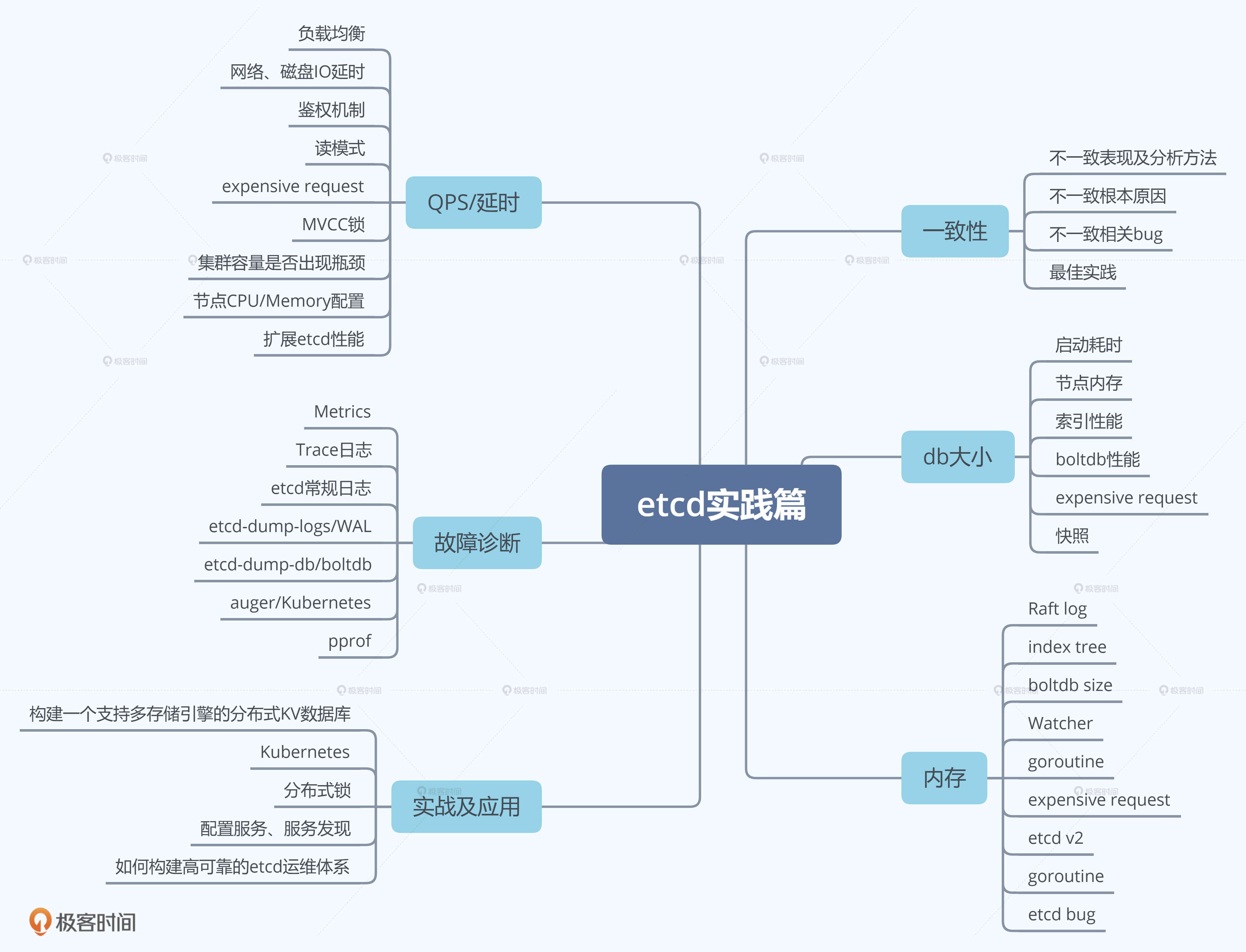 • 问题篇。为你分析etcd使用过程中的各类典型问题,和你细聊各种异常现象背后的原理、最佳实践。