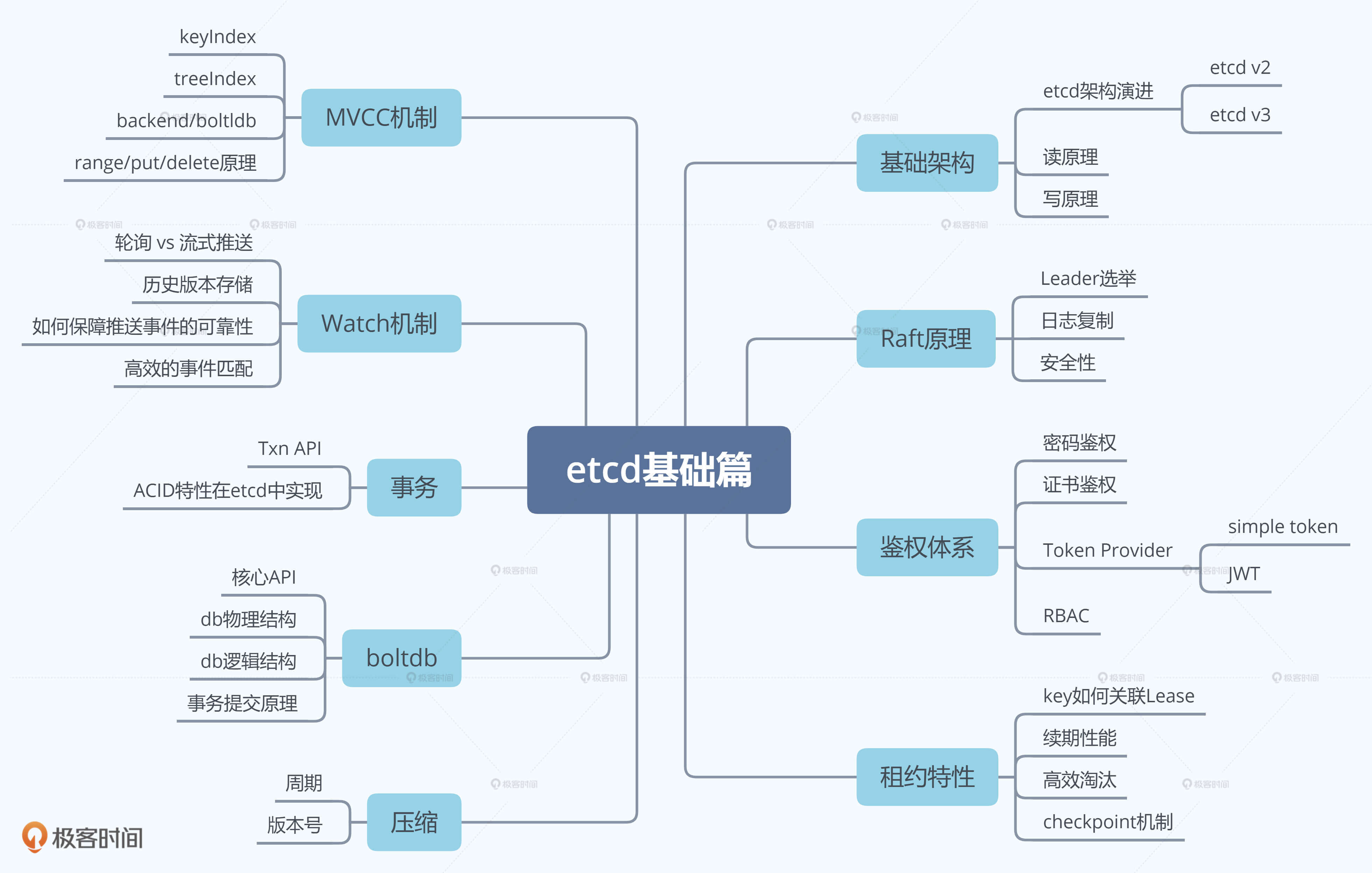当然基础篇讲的远不止这些,关于基础篇的更多内容,你可以参考下面的etcd基础篇思维导图:
