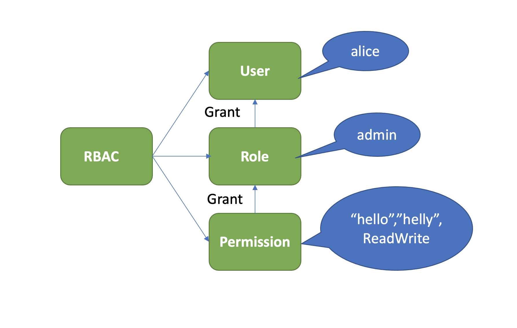 它由下图中的三部分组成,User、Role、Permission。User表示用户,如alice。Role表示角色,它是权限的赋予对象。Permission表示具体权限明细,比如赋予Role对key范围在[key,KeyEnd]数据拥有什么权限。目前支持三种权限,分别是READ、WRITE、READWRITE。