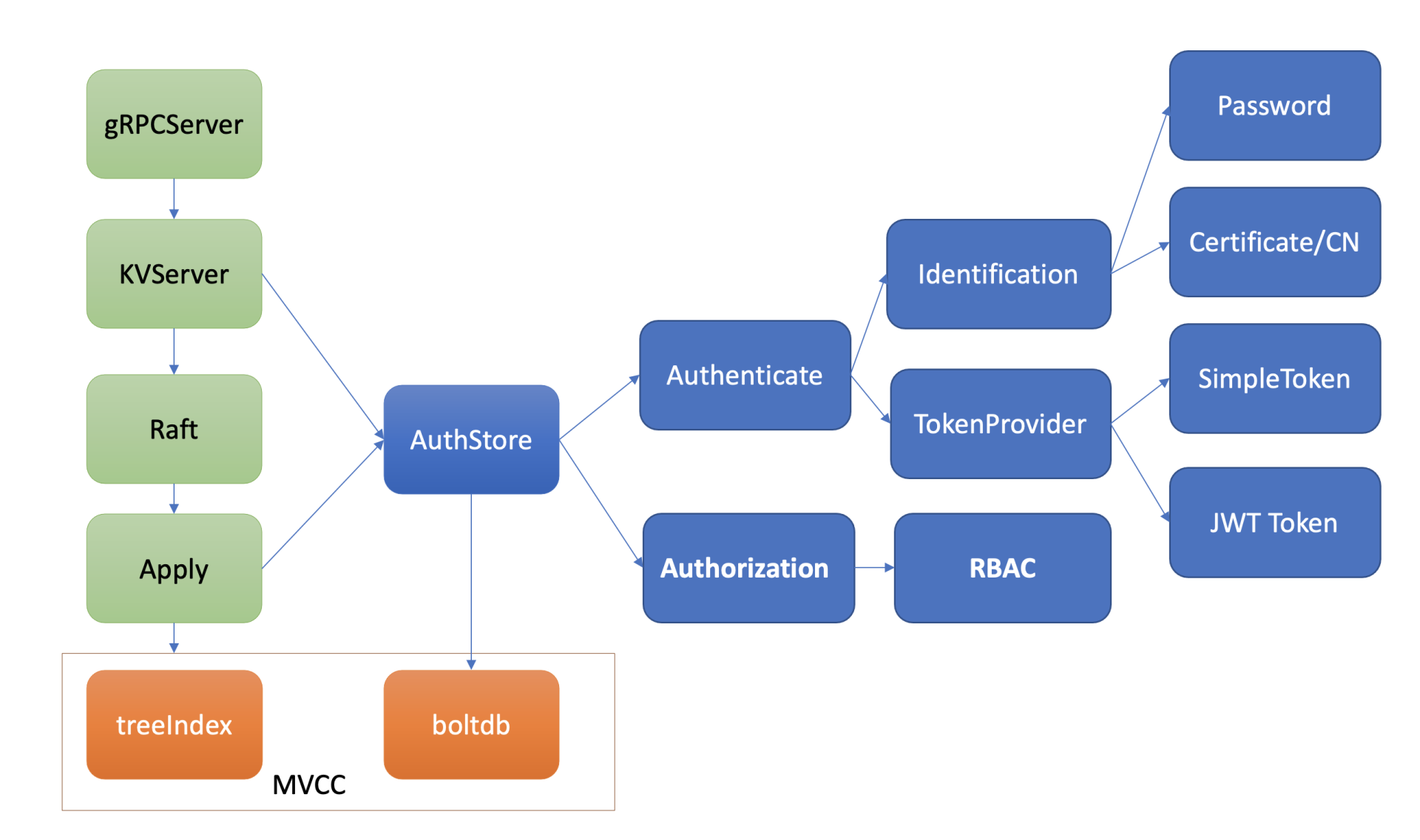 当你使用alice账号访问etcd的时候,你需要先调用鉴权模块的Authenticate接口,它会验证你的身份合法性。