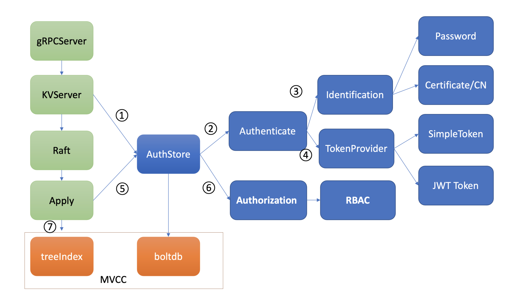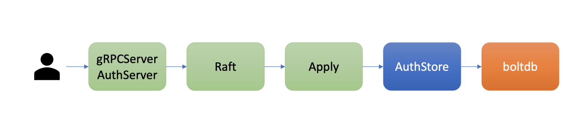 当对应的Raft日志条目被集群半数以上节点确认后,Apply模块通过鉴权存储(AuthStore)模块,执行日志条目的内容,将规则存储到boltdb的一系列“鉴权表”里面。