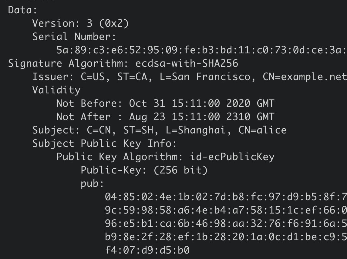 我们可以使用下面的openssl命令查看client证书的内容,下图是一个x509 client证书的内容,它含有证书版本、序列号、签名算法、签发者、有效期、主体名等信息,我们重点要关注的是主体名中的CN字段。