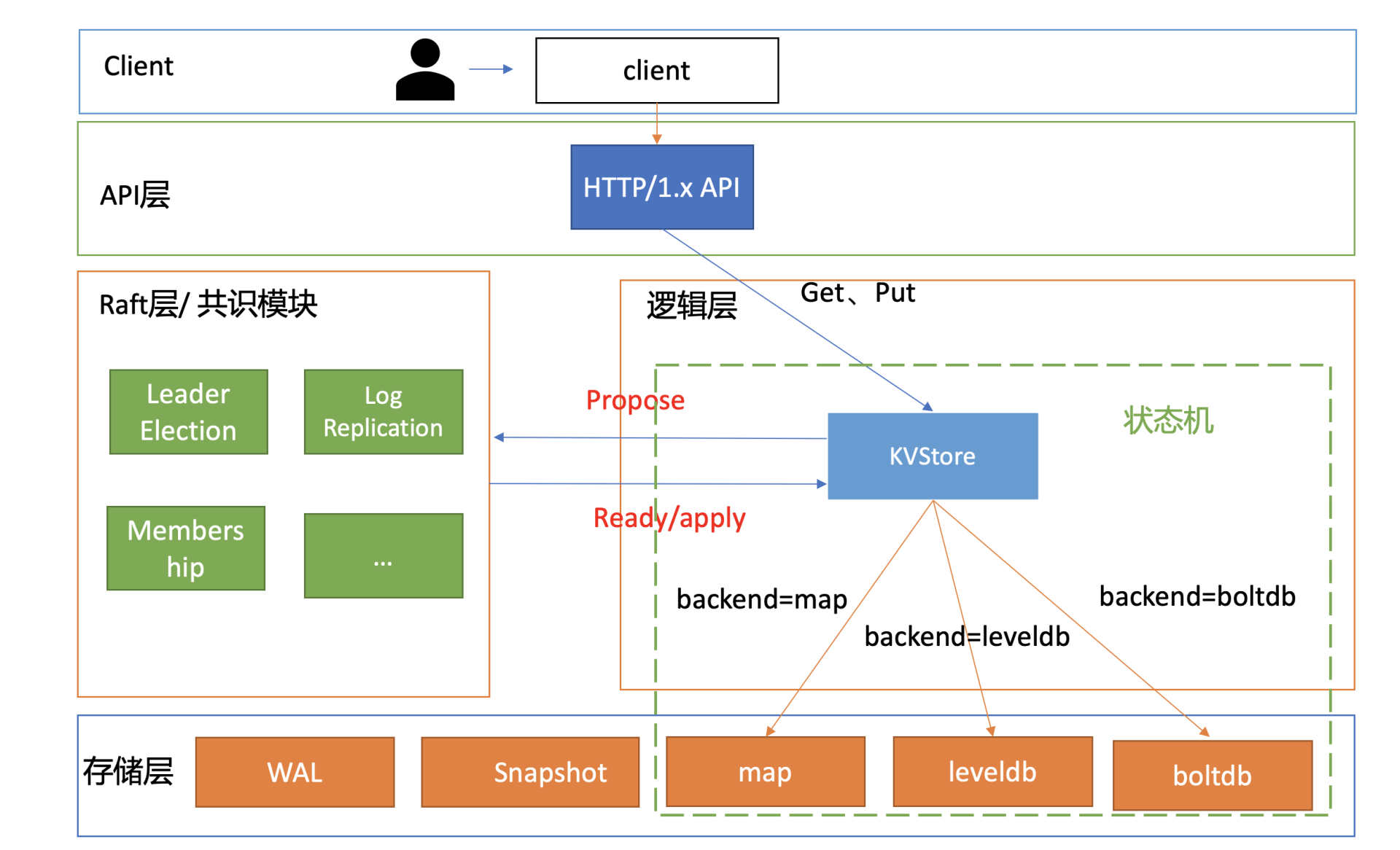 下面是我给你画的metcd整体架构设计,它由API层、Raft层的共识模块、逻辑层及存储层组成的状态机组成。