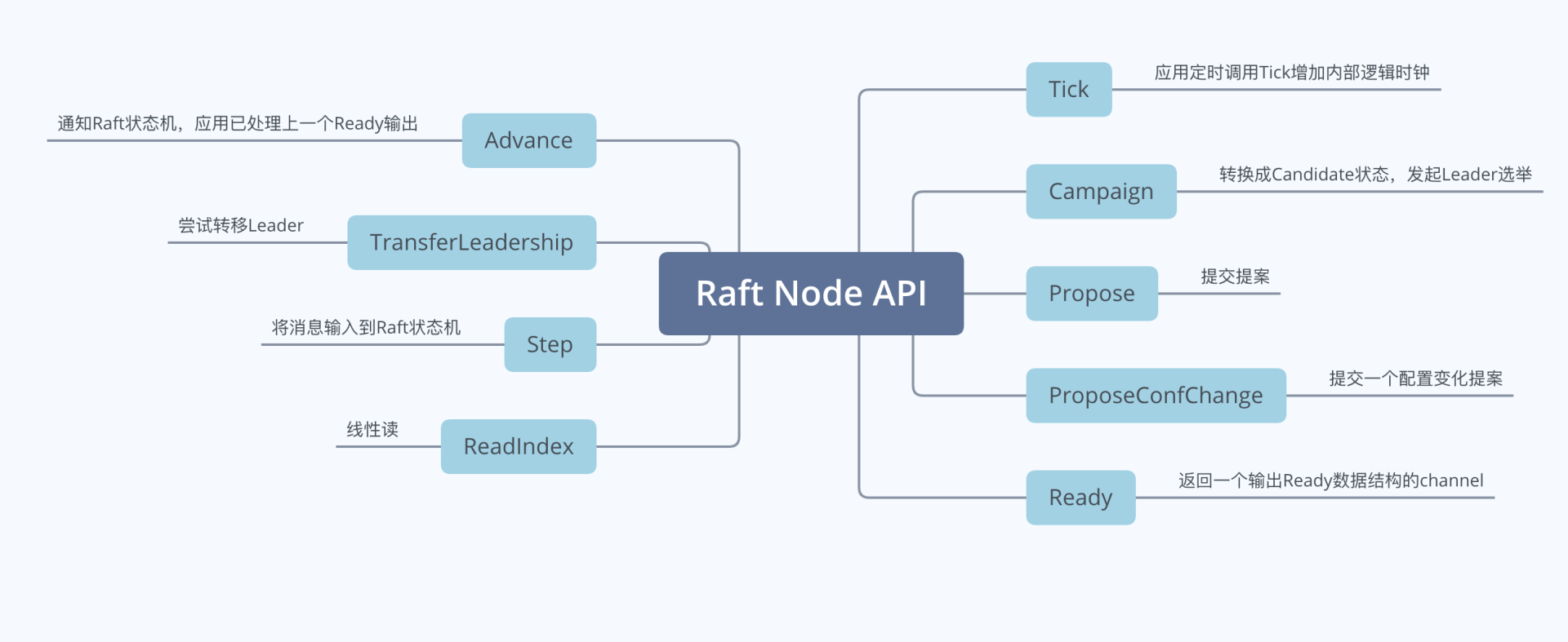 Raft作为一个库,它对外最核心的对象是一个名为Node的数据结构。Node表示Raft集群中的一个节点,它的输入与输出接口如下图所示,下面我重点和你介绍它的几个接口功能: