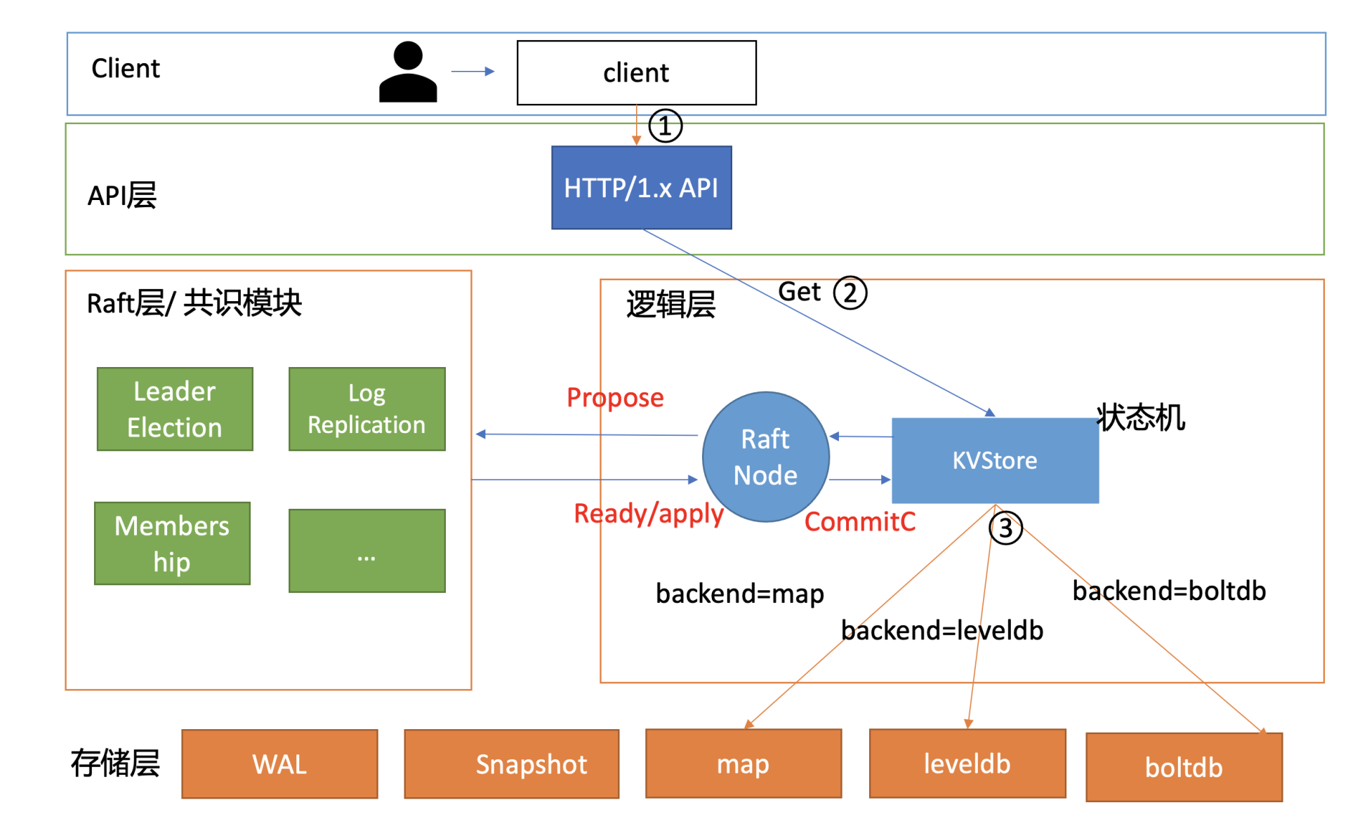 介绍完在metcd项目中如何使用Raft共识模块、支持多存储引擎后,我们再从整体上介绍下在metcd中写入和读取一个key-value的流程。