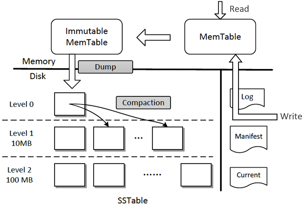 leveldb是基于LSM tree(log-structured merge-tree)实现的key-value存储,它的架构如下图所示(引用自微软博客)。