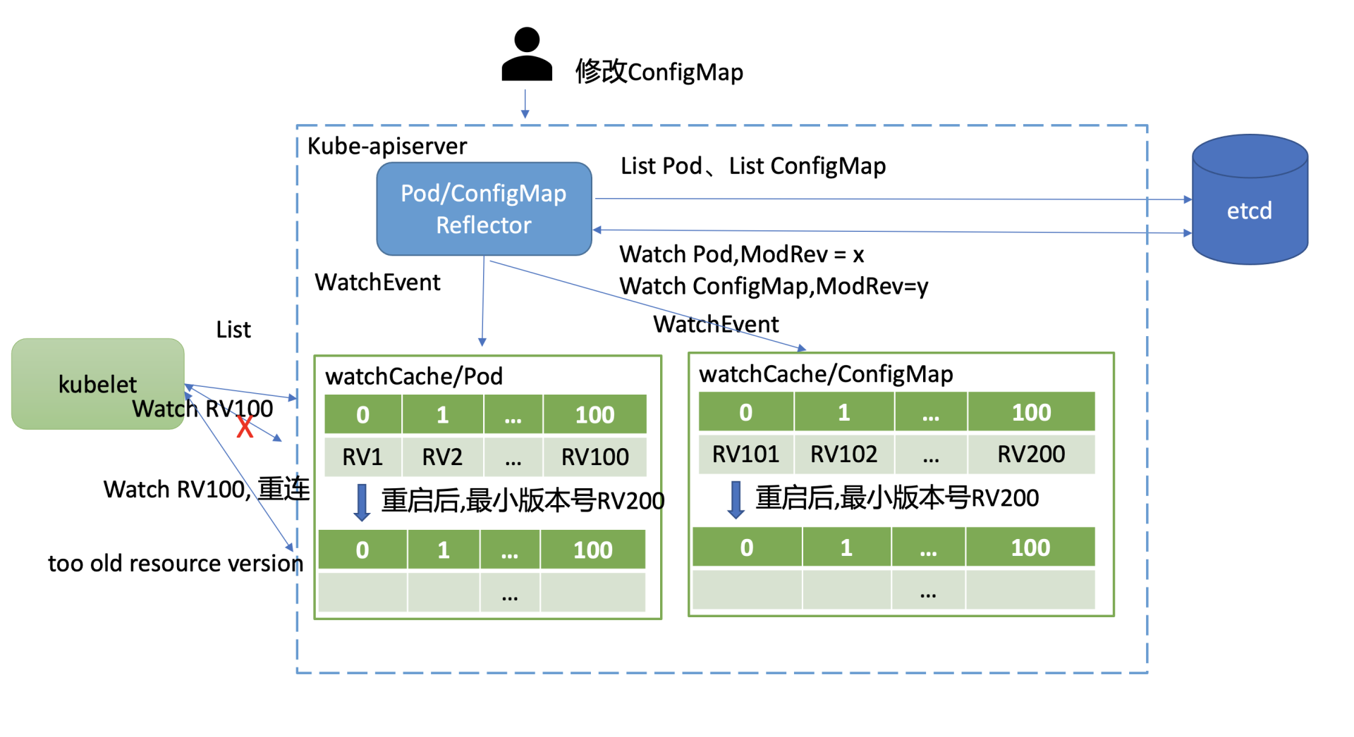 因此kube-apiserver重启后,client请求重建Pod Watch的Resource Version是RV100,而Pod watchCache中的滑动窗口最小Resource Version是RV200。很显然,RV100不在Pod watchCache所维护的滑动窗口中,kube-apiserver就会返回”too old resource version”错误给client,client只能发起relist expensive request操作同步最新数据。