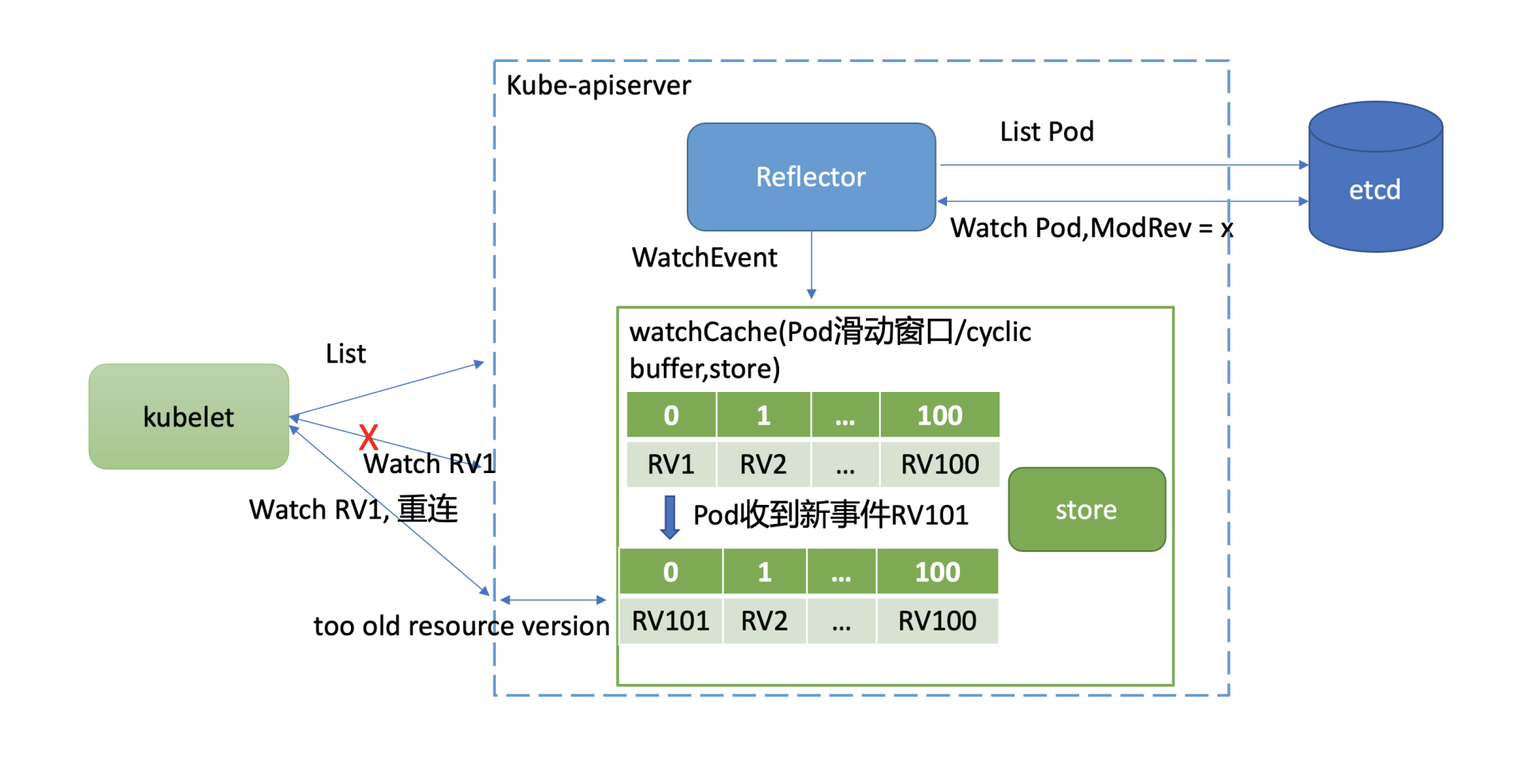 若此kubelet随后与kube-apiserver连接出现异常,它将使用版本号RV1发起Watch重连操作。但是kube-apsierver cyclic buffer中的Pod最小版本号已是RV2,因此会返回”too old resource version”错误给client,client只能发起List操作,在获取到最新版本号后,才能重新进入监听逻辑。
