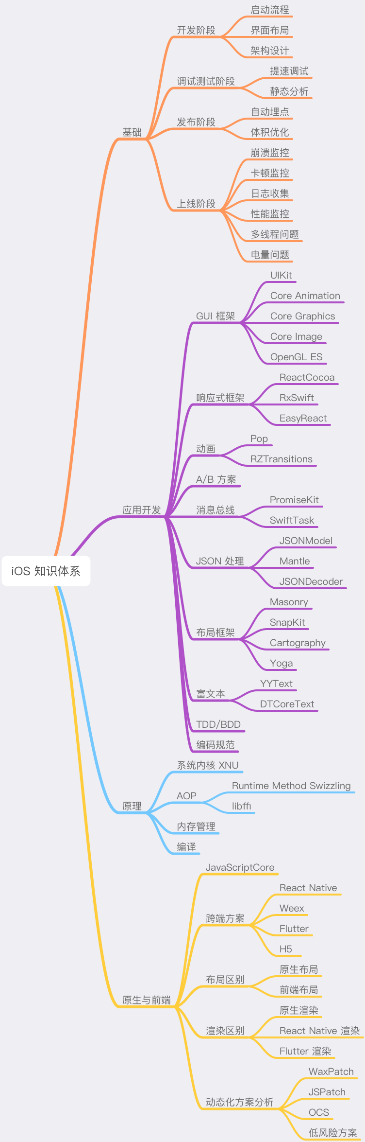 最后,我来把整个专栏中涉及到的基础、原理、应用开发和原生与前端的知识,梳理到一起,就形成了如下图所示的iOS知识体系。