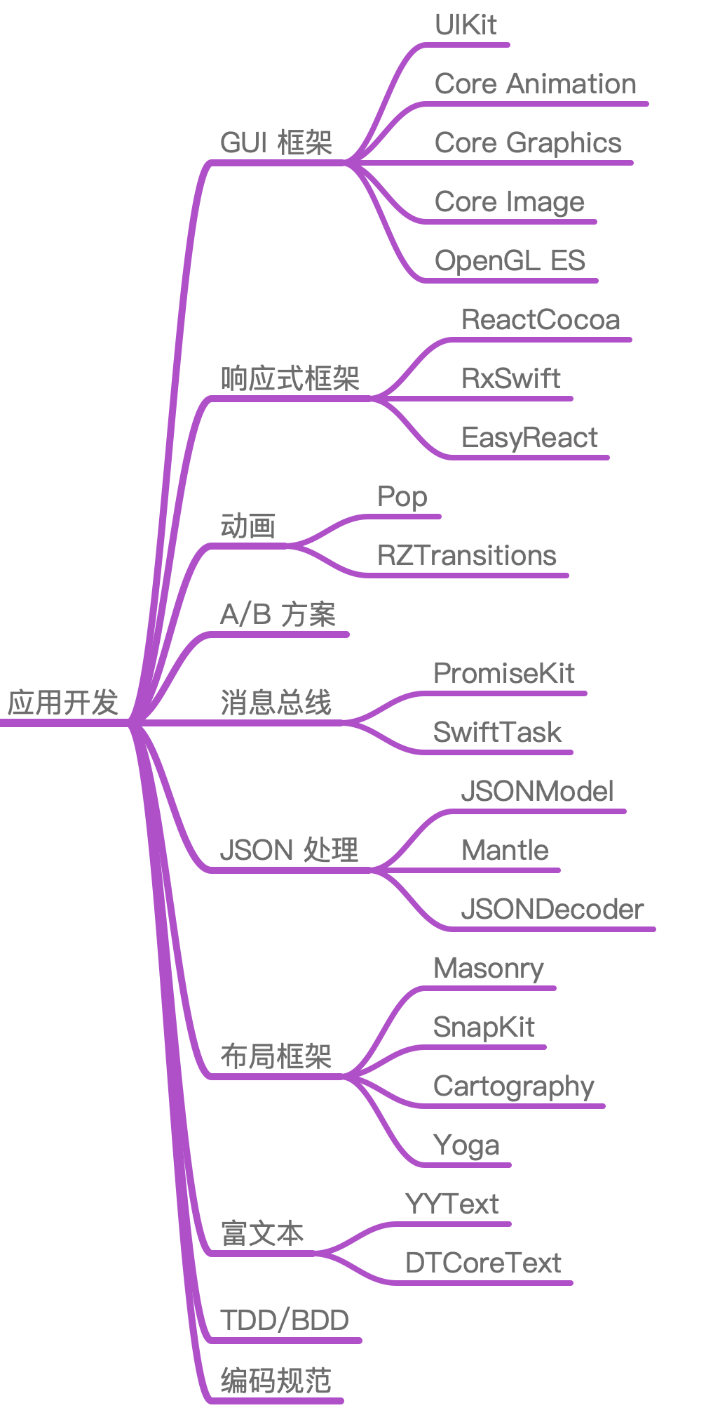 应用开发部分,我们需要关注的就是一些经典库,因为这些经典库往往出自技术大拿之手,代码结构和设计思想都非常优秀,同时经过了大规模的实践,不断打磨完善,具有很高的质量保障。比如:动画库 Pop,响应式框架 RAC、RxSwift,JSON 处理库 JSONModel、Mantle等。