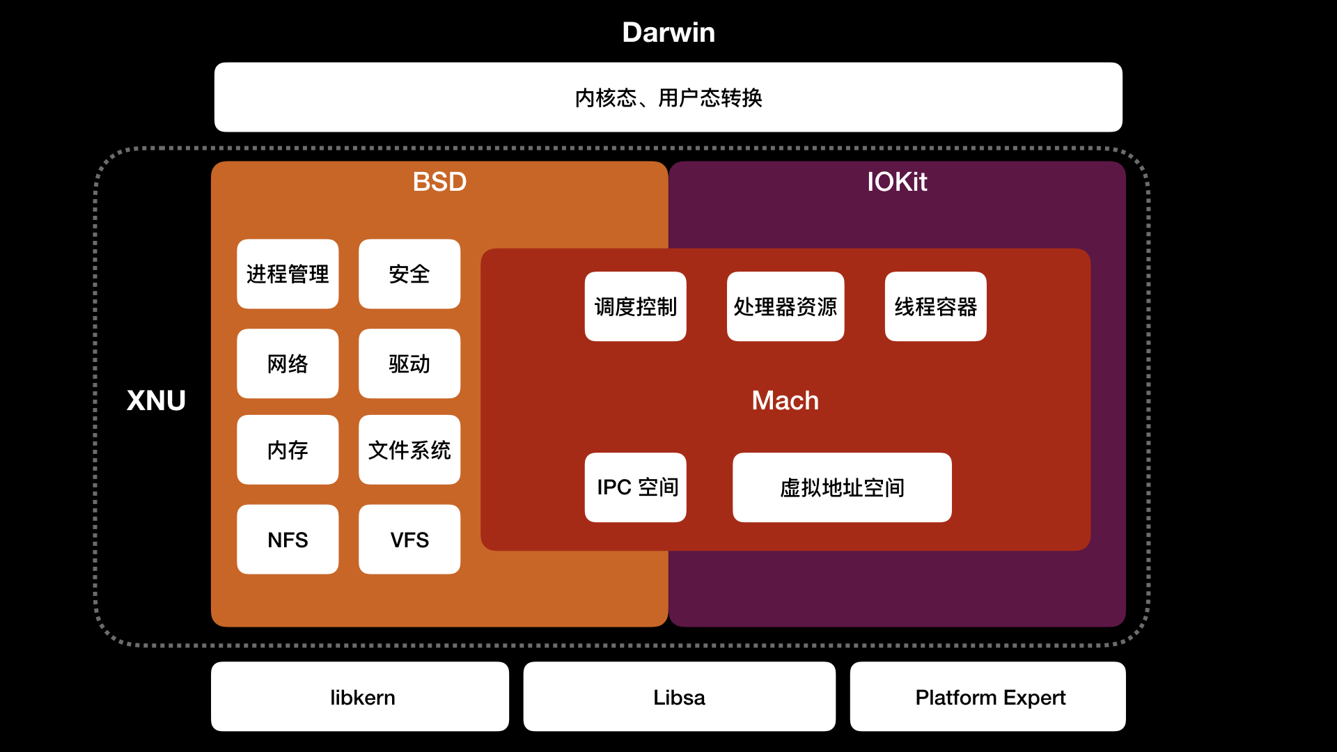 XNU 内部由 Mach、BSD、驱动 API IOKit 组成,这些都依赖于 libkern、libsa、Platform Expert。如下图所示: