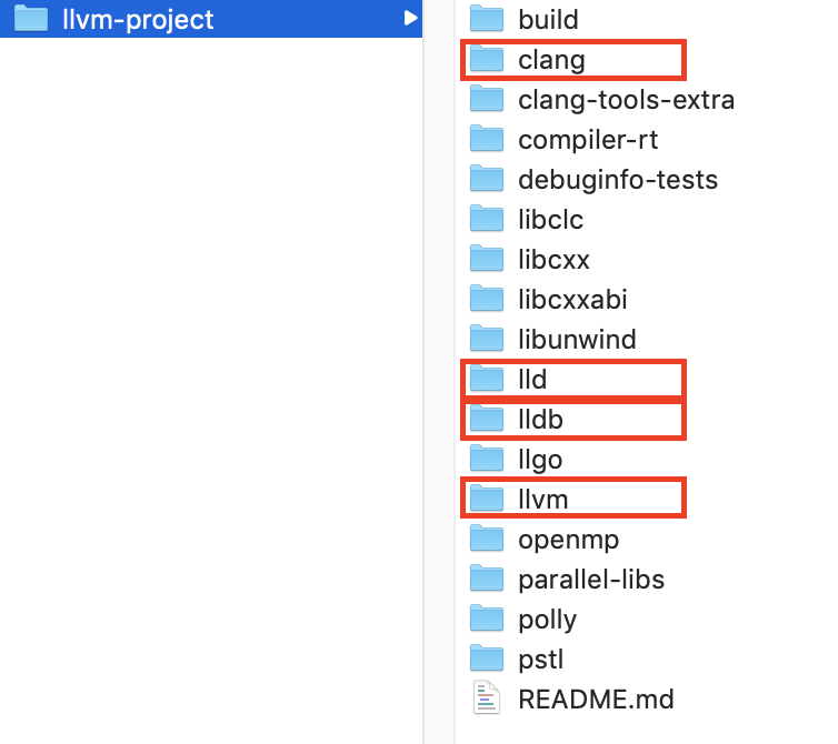 其中,clang 目录就是类 C 语言编译器的代码目录;llvm 目录的代码包含两部分,一部分是对源码进行平台无关优化的优化器代码,另一部分是生成平台相关汇编代码的生成器代码;lldb 目录里是调试器的代码;lld 里是链接器代码。