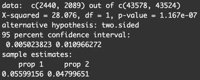 prop.test(x = c(2440, 2089), n = c(43578, 43524), alternative = "two.sided", conf.level = 0.95)