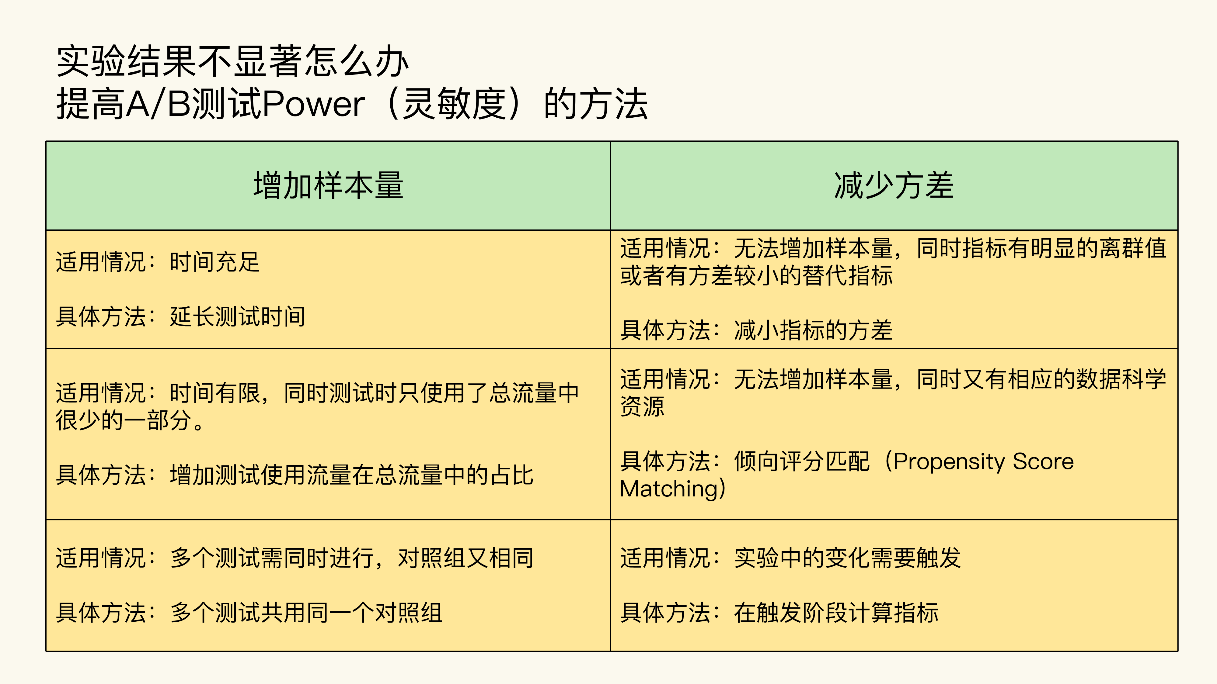 如果是第二种原因,那我们可以从A/B测试的角度进行一些优化和调整。具体来说就是,通过提高Power来提高A/B测试检测到实验结果不同的概率。在第6节课我讲过了,Power越大,越能够准确地检测出实验组与对照组的不同。所以当我们提高了Power之后,如果仍然发现测试结果不显著,这样才能得出“两组指标事实上是相同的”的结论。