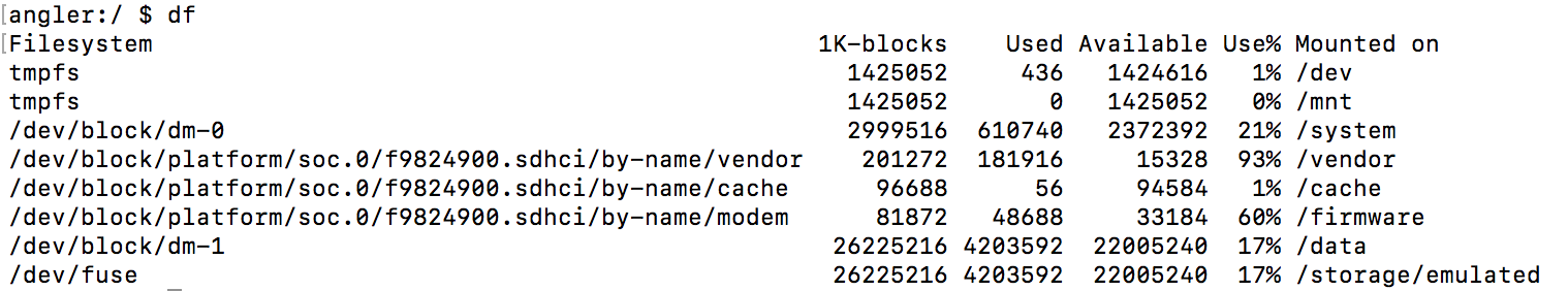 Android系统可以通过/proc/partitions或者df命令来查看的各个分区情况,下图是Nexus 6中df命令的运行结果。